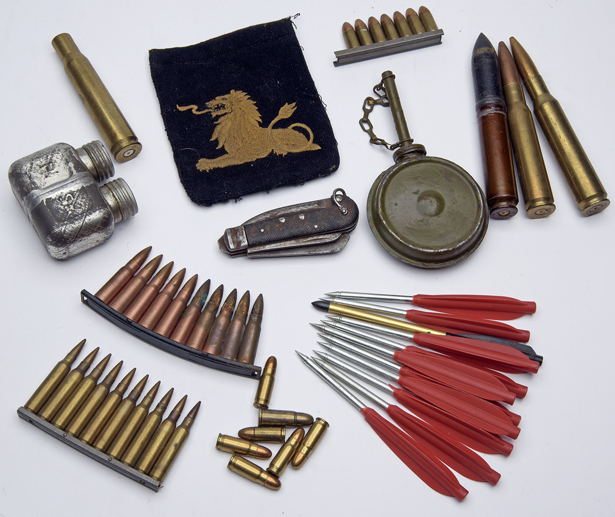 A GROUPING OF MIXED MILITARIA, being a collection of inert cartridges, some on stripper-clips; an oil bottle for the German MG34/42; a twin oil-bottle for the Russian Mosin Nagant; an undated military clasp-knife, worn and rusted; 11 cross-bow bolts; an unknown gold couchant lion cloth patch