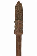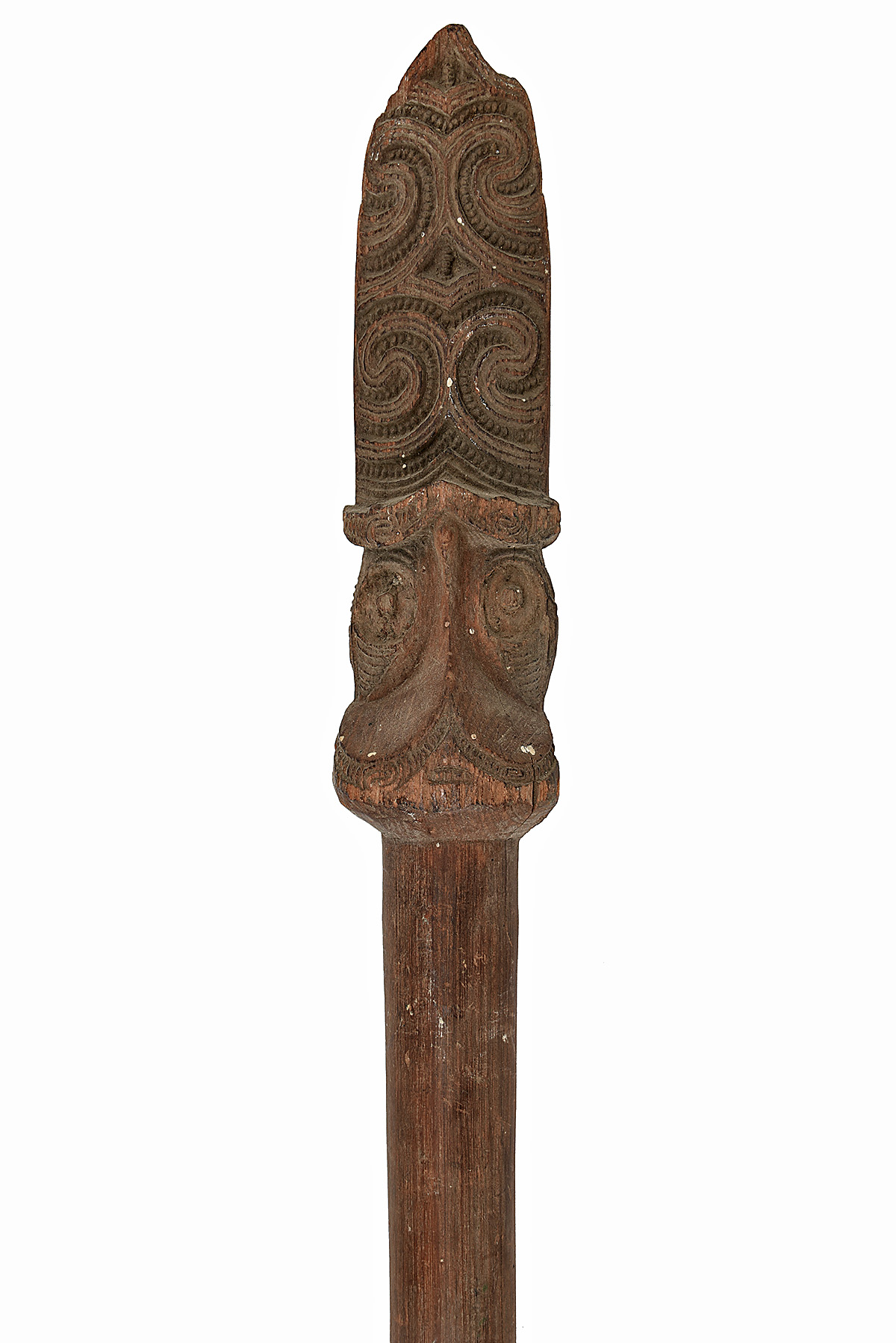 A RARE MAORI WAR CANOE PADDLE, circa late 19th Century, carved from a single piece of hard-wood, of typical narrow blade form with carved shaft head, some chipping to the blade, some losses to one side of the carved head and two drilled holes for display purposes, approx 74 in. length