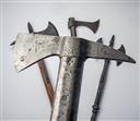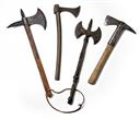 A GOOD ARP RESCUE AXE PLUS THREE OTHER REPRODUCTION BATTLE-AXES, dated 1940, 8 in. steel head with 2 3/4 in. blade to one side and spike to the other, 8 in., stamped 'PERKS / ROV PAT / 89204 / A.R.P. / 1940 / THE / DEFIANT', steel socket riveted to a hickory shaft, 16 1/2 in length, together with three reproduction medieval battle-axes