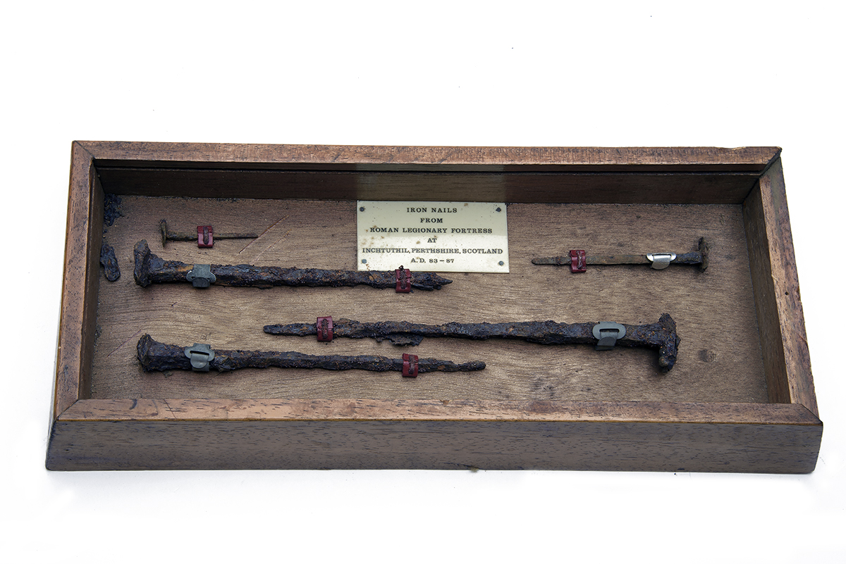 A CASED COLLECTION OF FIVE ROMAN NAILS FROM THE INCHTUTHIL FORTRESS HOARD, circa A.D. 83-87, five iron nails of various sizes from circa 8 in. to 2 in., mounted in a glass-fronted wooden display case with a hard plastic label stating 'IRON NAILS / FROM ROMAN LEGIONARY FORTRESS / AT / INCHTUTHIL, PERTHSHIRE. SCOTLAND / A.D. 83-87', Inchtuthil Fortress was situated on the north bank of the River Tay, representing the only complete plan of a legionary fortress anywhere in the Roman Empire, it was built in AD 82 or 83 as the advance headquarters for the forces of governor Gnaeus Julius Agricola in his campaign against the Caledonian tribes and was abandoned in A.D. 86 or 87; when excavated, a pit was found in the summer of 1960 containing some 10 tons of nails and other iron objects buried by the troops to deny them to the local tribes when after the fortress was evacuated