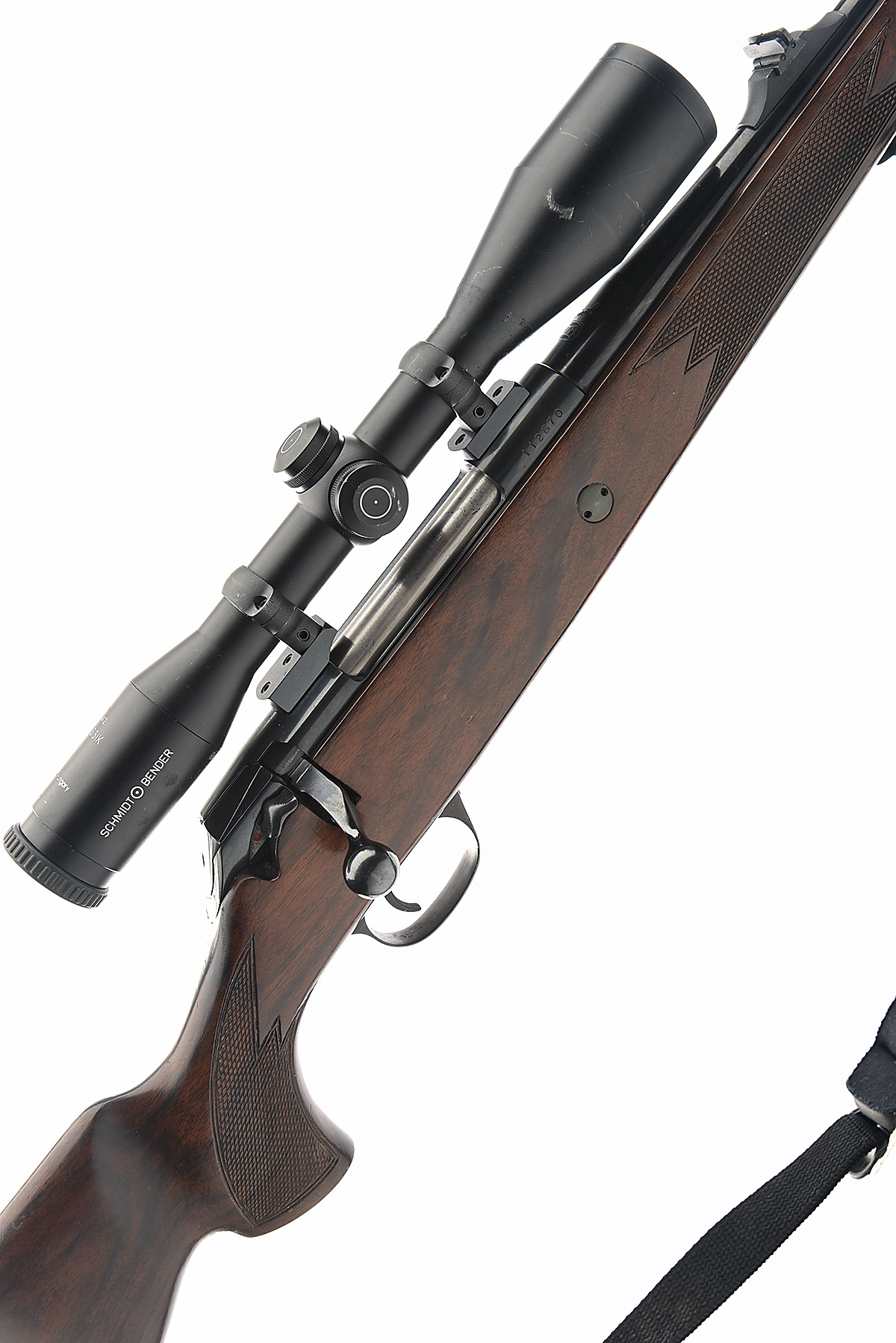 MAUSER .270 WIN. 'MOD 225' BOLT-MAGAZINE SPORTING RIFLE, serial no. 112670, circa 1990, 22 1/2in. unsighted nitro barrel, threaded for sound moderator, fore-sight missing, leaf rear-sight with 1 x folding sight, fitted with a Schmidt & Bender 6x42 Klassik telescopic sight serial no. 32700, manual safety, detachable magazine, folding bipod, well-figured pistolgrip stock with cheekpiece, canvas sling