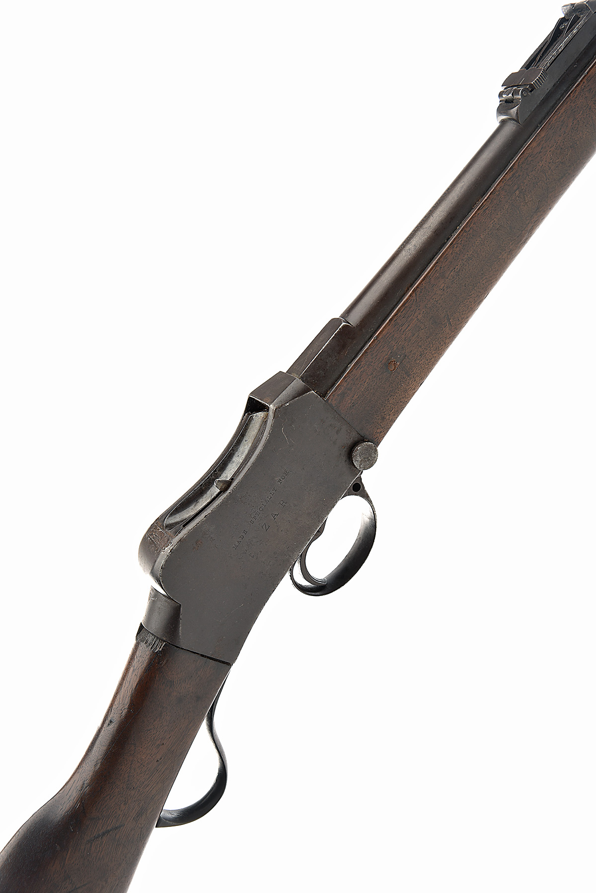 A .577-450 MARTINI HENRY SPORTERISED RIFLE BY WESTLEY RICHARDS FOR THE Z.A.R. CIRCA 1896, serial no. 32320, with 33 in. Birmingham proofed barrel with block and blade front-sight, and ladder rear-sight. the barrel marked 'HENRY RIFLING' in front of the sight and 'WESTLEY RICHARDS' behind, the knoxform stamped with dated triangle '1898', the rifle is fitted with Francotte detachable Martini action, right-side of the body stamped 'MADE ESPECIALLY FOR THE Z.A.R. and on the left with the makers name 'WESTLEY RICHARDS' and triangle trademark, iron mounted two piece walnut stock, the forend cut back to 13 1/2 in. This is one of a large quantity of rifles supplied by Westley Richards to the Z.A.R. Zuid Africa Republic, or Transvaal in the run up to the Boer War