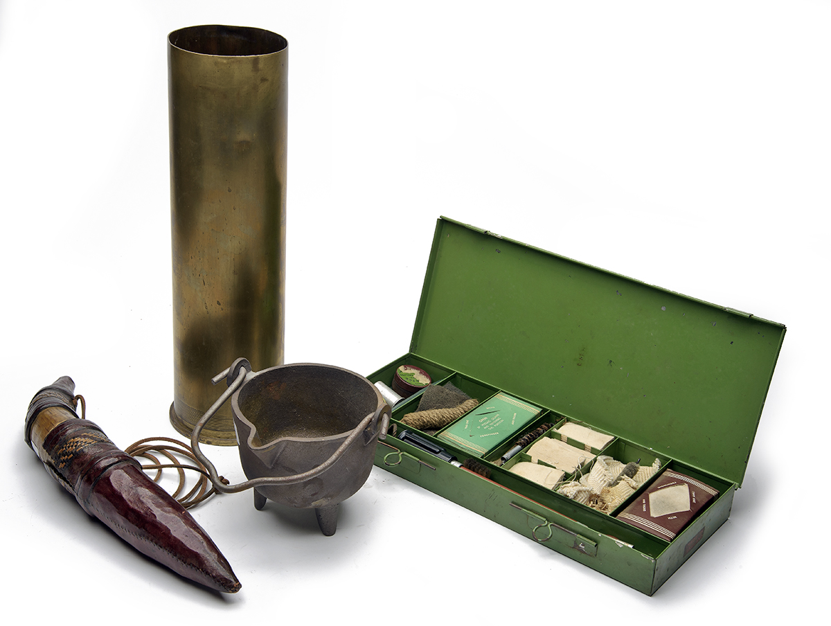 A GROUP OF FOUR MIXED ITEMS, being 1) a decorative north African leather-covered powder horn, worn with splitting to leather, horn split and partially frozen in leather carrier, 15 in, overall; 2) a brass 105mm shell case, 15 in.; 3) a 5 in. cast iron lead melting pot; 4) a vintage Parker-Hale 'Safari' Gun Cleaning Outfit, used