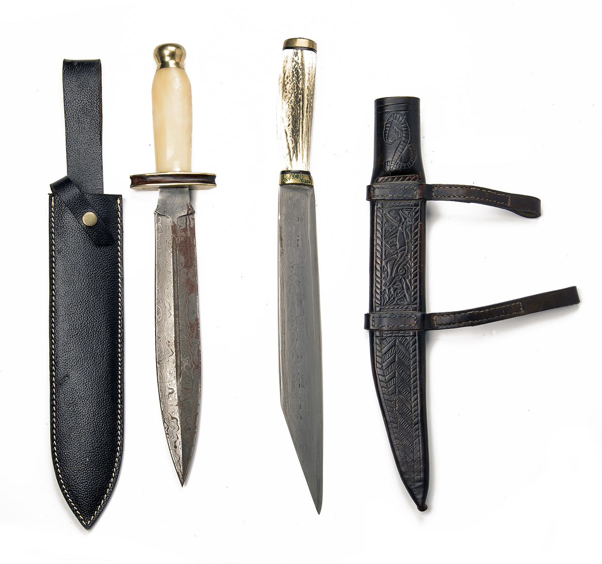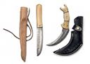 A GROUP OF FOUR BETTER REPRODUCTION SHORT SWORDS / KNIVES, being 1) a Viking sea-axe with single-edged12 1/2 in. damascus steel blade, plastic imitatation bone hilt with brass mounts, tooled heavy brown leather scabbard with belt straps, 19 in. overall; 2) an Egyptian style double-edged 11 in. damascus steel blade, plastic hilt with brass fittings, black leather scabbard, blade with rust patches, 18 in. overall; 3) a scandinavian skinning knife with single-edged 5 in. decorated steel blade set into a bone and wood hilt, with it's pale leather scabbard, 12 in. overall; a 'bear-claw' knife with 5 in. double-edged steel damascus blade, plastic grips, black tooled leather scabbard, 9 in. overall