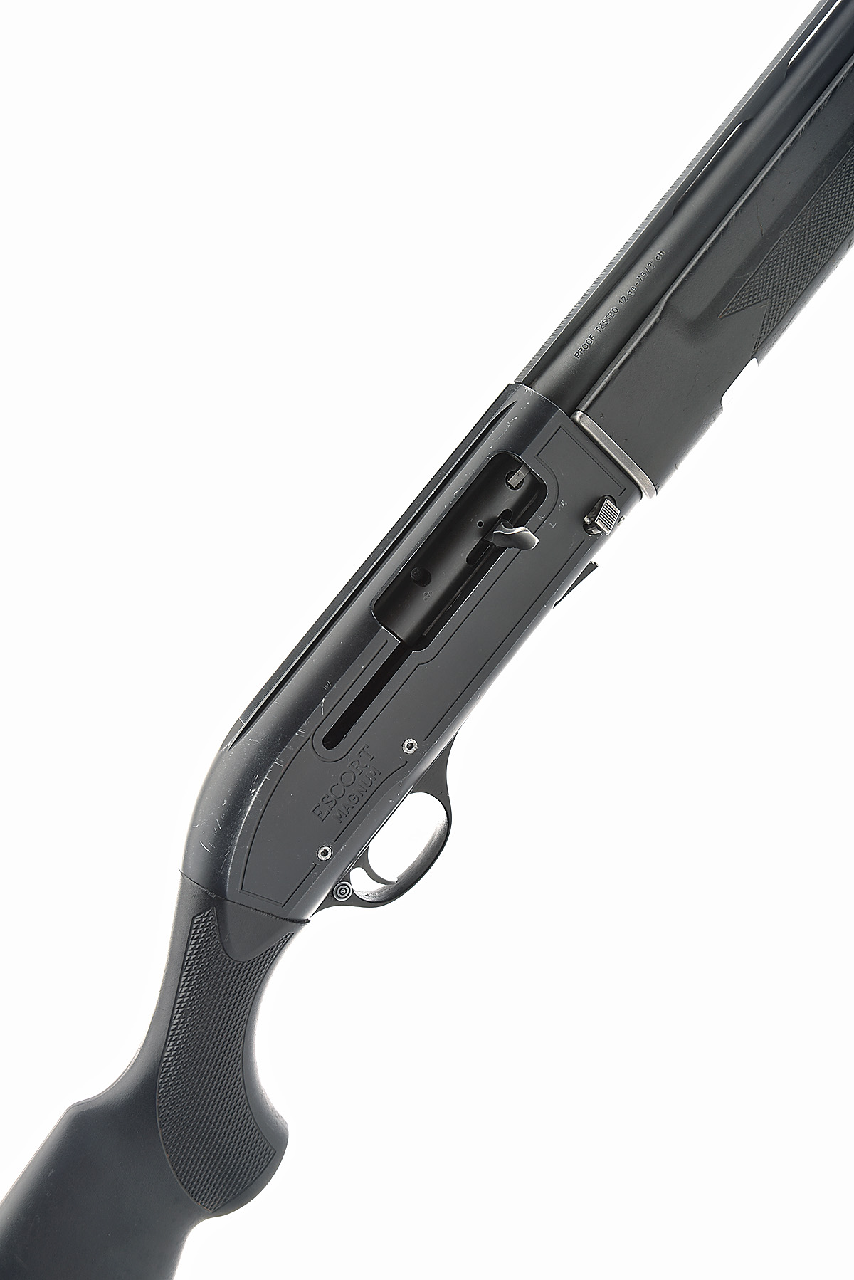 AN F.A.C. HATSAN 12-BORE (3IN.) 'ESCORT MAGNUM' SEMI-AUTO SHOTGUN, serial no. 088931, circa 2007, 28in. steel-shot proved nitro barrel with 7mm ventilated matt rib, 3in. chamber, multichoke (no spares), manual push-button safety, magazine cut-off switch, 14in. synthetic pistolgrip stock including rubber recoil pad, the whole in matt black finish