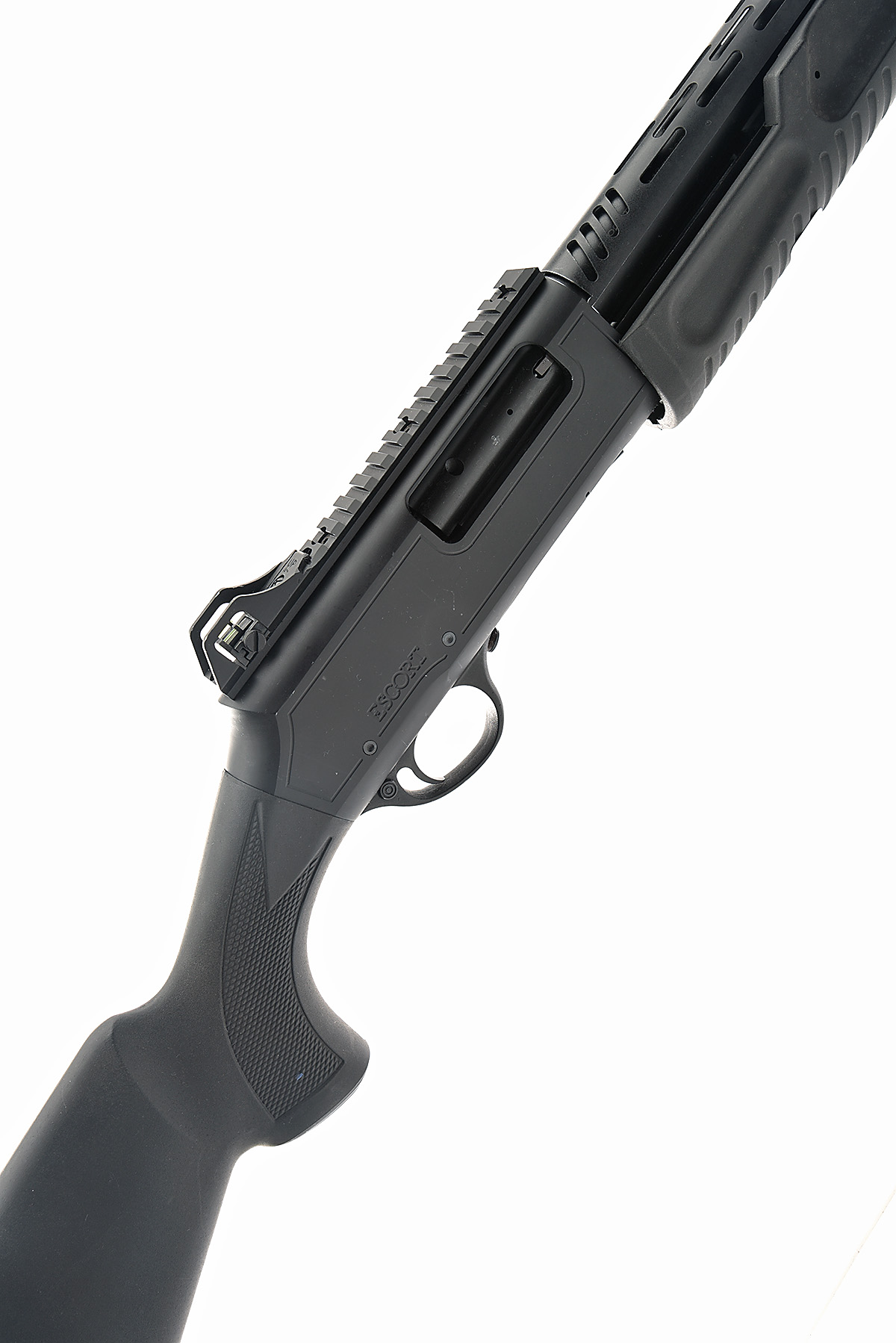 AN F.A.C. HATSAN 12-BORE (3IN.) 'ESCORT MILITARY & POLICE' PUMP-ACTION SHOTGUN, serial no. 248011, circa 2011, 24in. steel-shot proved nitro barrel, block-mounted high-vis bead fore-sight, receiver fitted with an accessory rail and adjustable peep rear-sight, 3in. chamber, multichoke (no spares), barrel fitted with heat shield, manual push-button safety, 14 1/2in. synthetic pistolgrip stock including ventilated rubber recoil pad, the whole in matt black finish