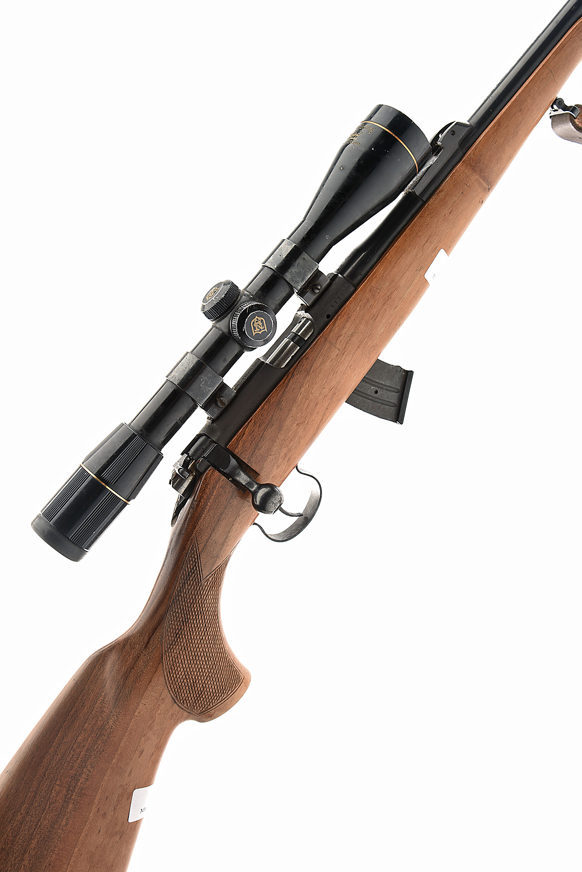 CZ .22 L.R. 'MOD 2-E-H ' BOLT-MAGAZINE SPORTING RIFLE, serial no. 413256, circa 1989, 25in. nitro barrel, threaded for sound moderator, ramp-mounted blade fore-sight, rear-sight missing, fitted with a Nikko stirling 6x40 telescopic sight, manual safety, detachable banana magazine, pistolgrip stock, leather sling