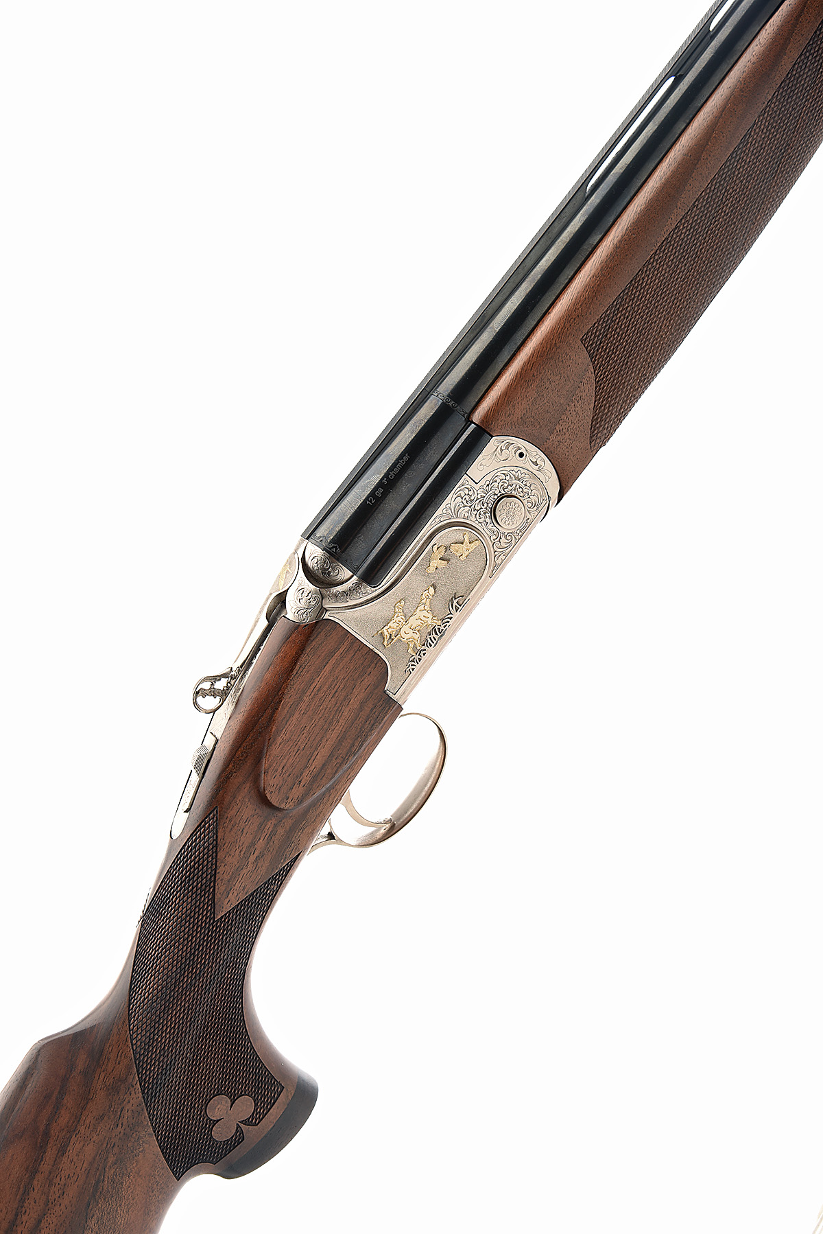 BETTINSOLI 12-BORE (3IN.) 'OVERLAND' SINGLE-TRIGGER OVER AND UNDER EJECTOR, serial no. 186258, dated 2003, 27 1/2in. nitro barrels with 7mm ventilated matt top-rib, multichokes (with spares), pierced hold-open toplever, manual safety with integral barrel selector switch, acanthus scroll engraving surrounding carved scenes of gold-highlighted hound flushing game, the underside with a gold-highlighted woodcock within a trèfle motif, matt silver finish, 15 1/4in. pistolgrip stock, the chequering with further trèfle motifs, including 1ion. ventilated rubber recoil pad, weight 6lb. 10oz., in its makers universal case