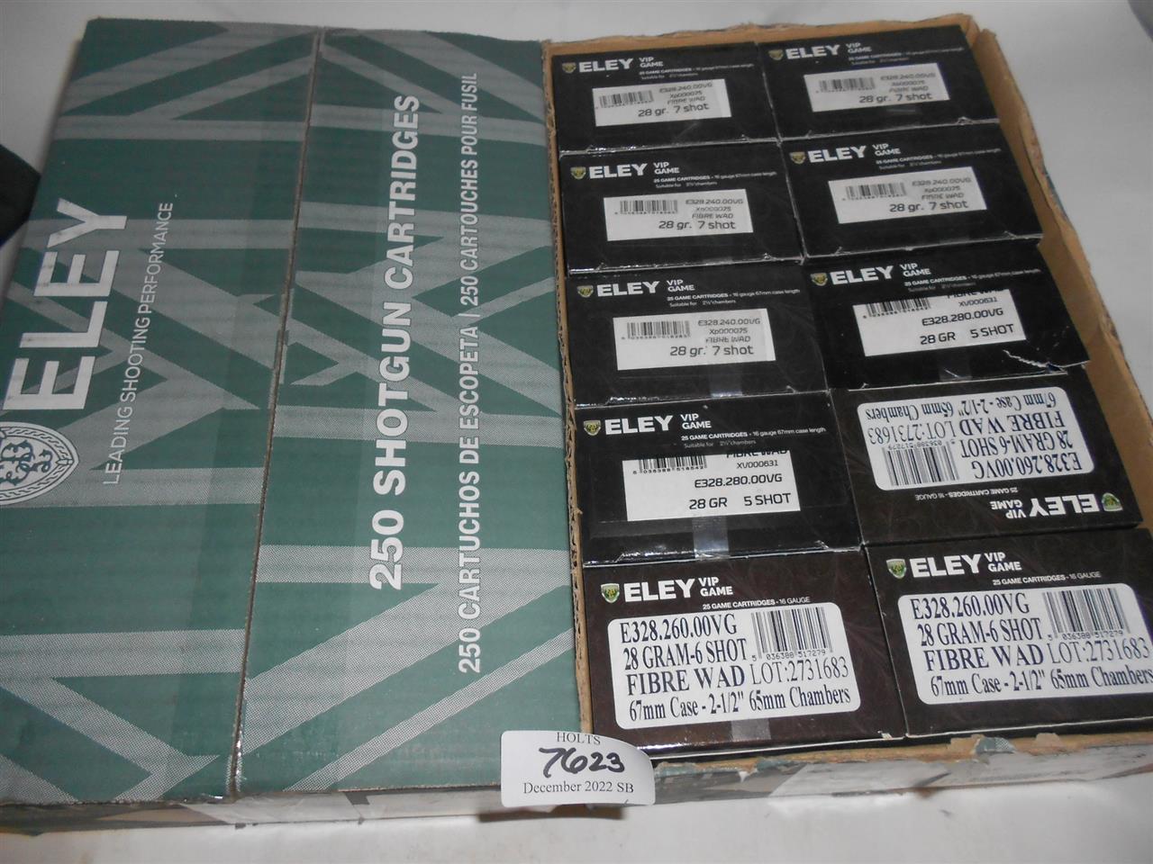 500 ELEY 16 BORE VIP CARTRIDGES, 67mm, 28grm, 5/6/7 SHOT, FIBRE WAD Please be advised that cartridges/ammunition, primers, primed cases, blanks and percussion caps cannot be sent or exported to you by post or carrier. Due to this rule, within 30 days of the sale date, please arrange with our shipping department a collection at one of our regional valuation days on mainland UK, or, you would be most welcome to collect from our offices at PE31 6HA in Norfolk. If collection is not arranged within 30 days, that will indicate that the items are not required and they will be offered in our next sale.