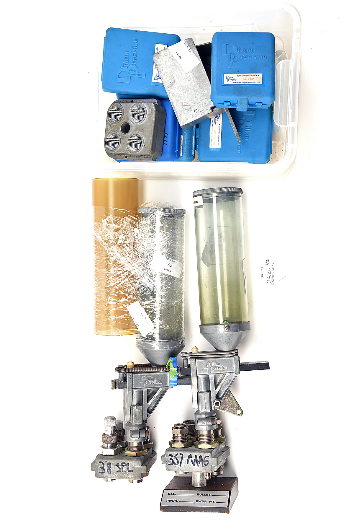 A COLLECTION OF DILLON 550 PRESS WITH ACCESSORIES , comprising of, powder measure complete with .357 dies, powder measure complete with .38spl dies, caliber conversion kit .45acp, .308Win, 30-06, 6x55, 9mm/38 super, .303, .44, .303., various other accessories