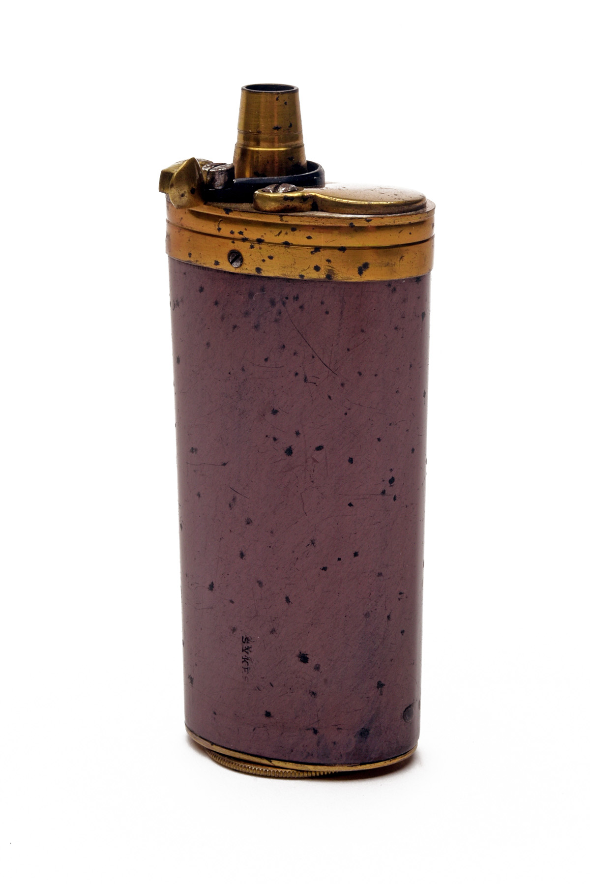 A 3-WAY COPPER AND BRASS POWDER FLASK, circa mid-late 19th Century, 3 3/4 in. unnamed, screw-threaded base, spring broken, dented on one side