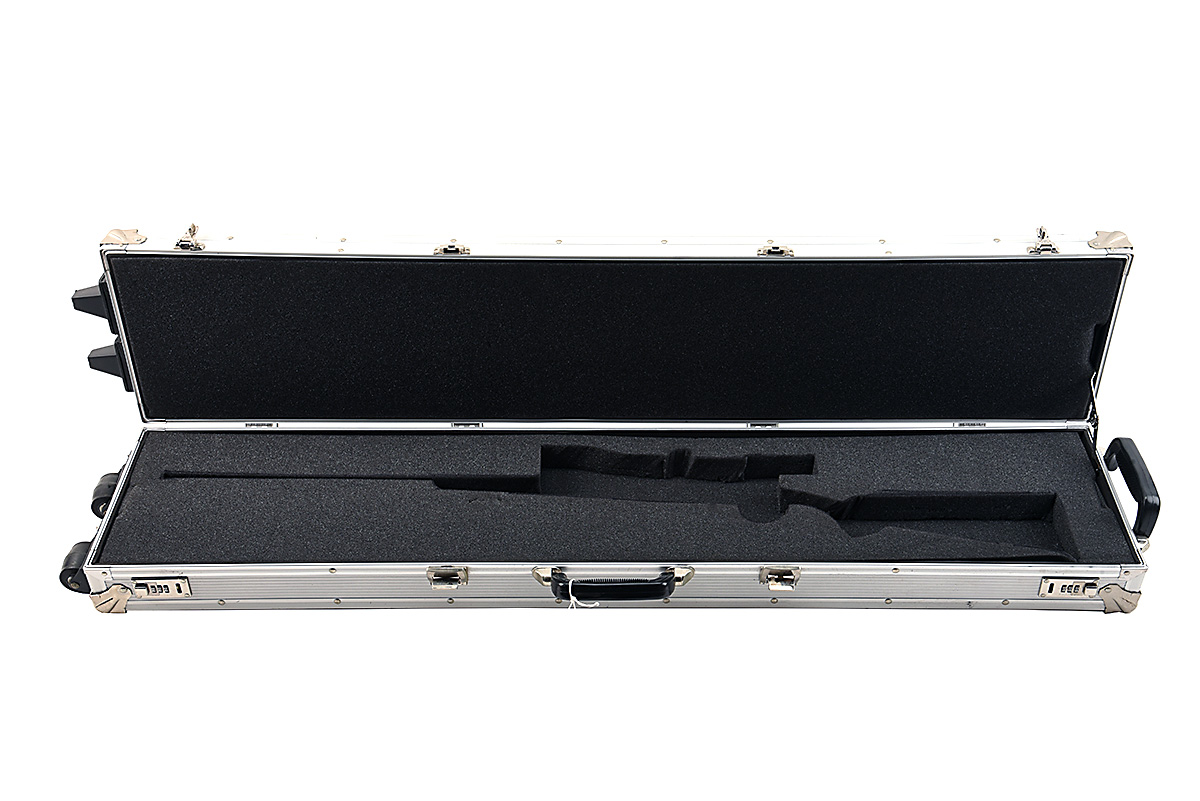 A ALUMINIUM GUN CASE, 'A franzen aluminium gun case on wheels with internal measurements of 123cm(l) x 24cm(w) x 8cm (d including lid)'