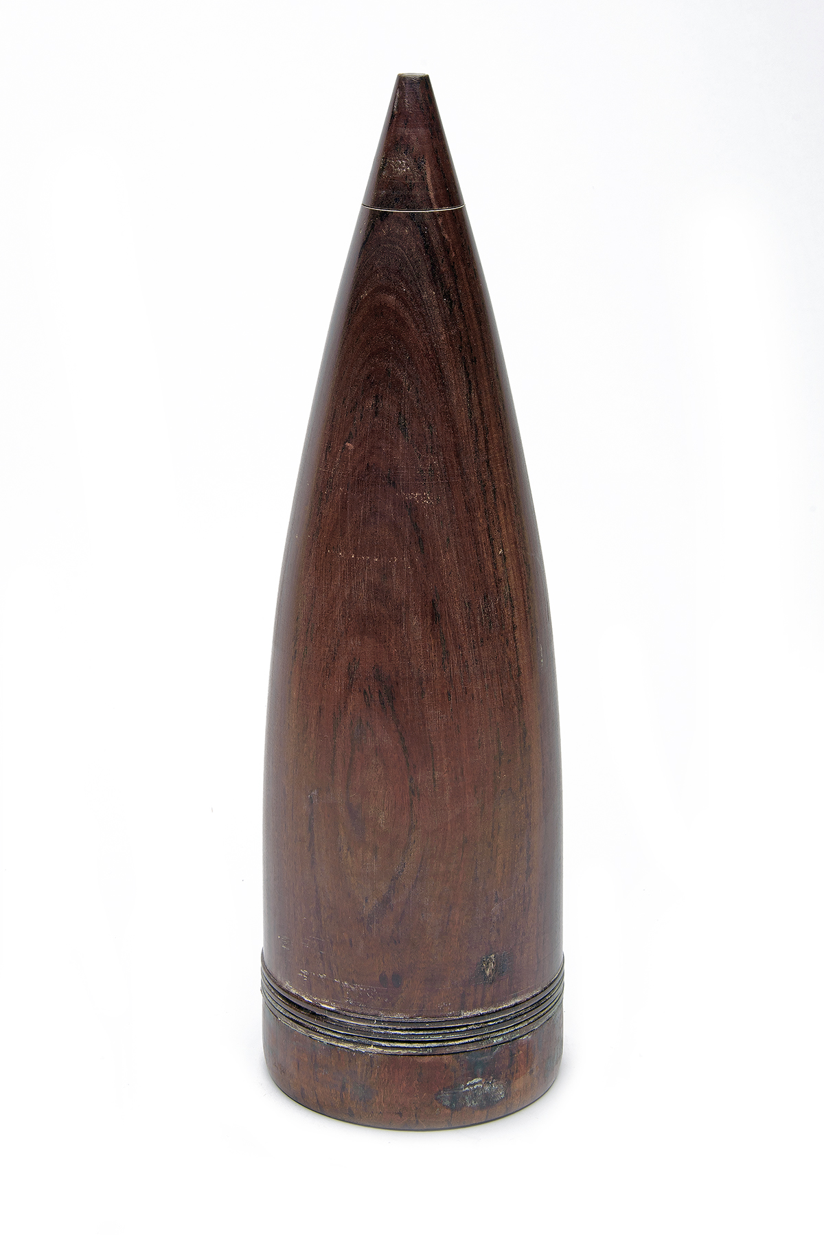 A POLISHED HARD-WOOD REPLICA OF A 105mm SHELL, circa late 20th Century, a shallow loss of 3/4 in. x 1/4 in., base wear suggests previously sat in a shell case, 14 in. high