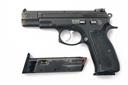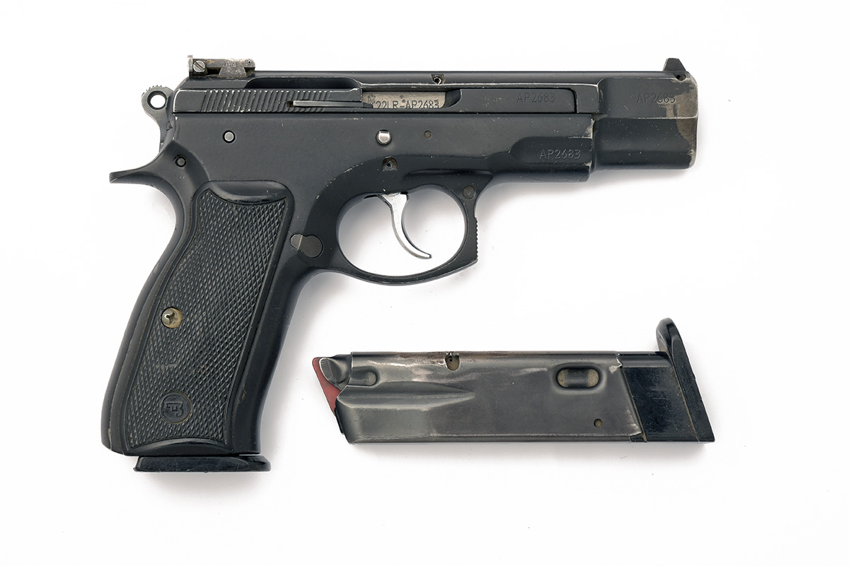 A CASED .22 (L/R) SEMI-AUTOMATIC CZ 75 KADET PISTOL, serial no. AP2683, made as a trainer for the 9mm variant, with 4 1/2in. barrel, two-piece slide, blacked frame and chequered black plastic grips, with a two-shot spare magazine in an abs plastic carry case