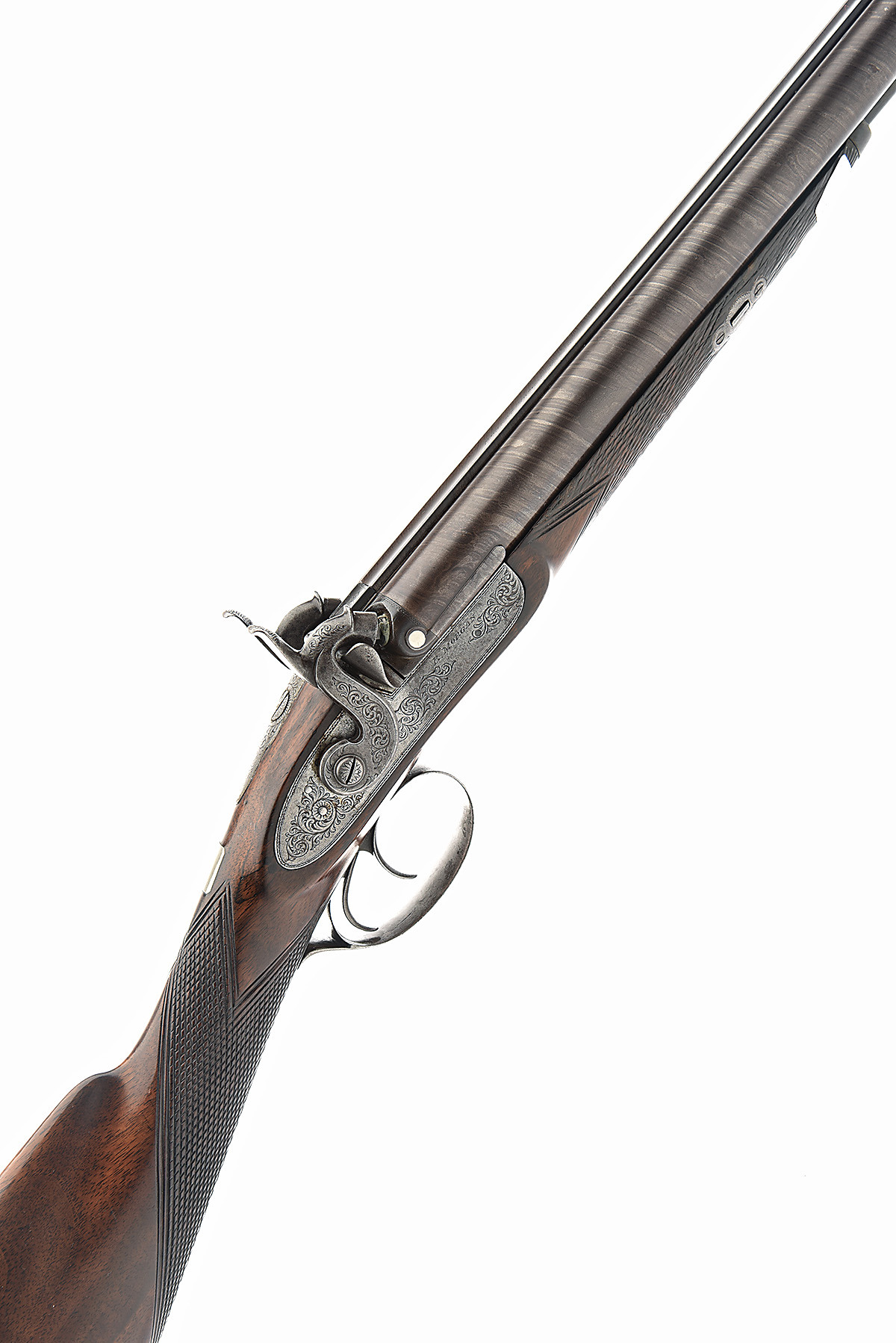 A 13-BORE PERCUSSION SPORTING-GUN SIGNED R. MORGAN, no visible serial number, circa 1860, with twist 31in. barrels signed 'ROBERT MORGAN, MAKER' (rubbed, top-rib possibly lifting), signed bar-action engraved locks, chequered walnut half-stock (repaired behind right lock and tang) and brass-tipped ramrod