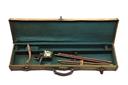 A CANVAS AND LEATHER SINGLE GUNCASE, fitted for 30in. barrels, the interior lined with green baize, brass lock (key missing)
