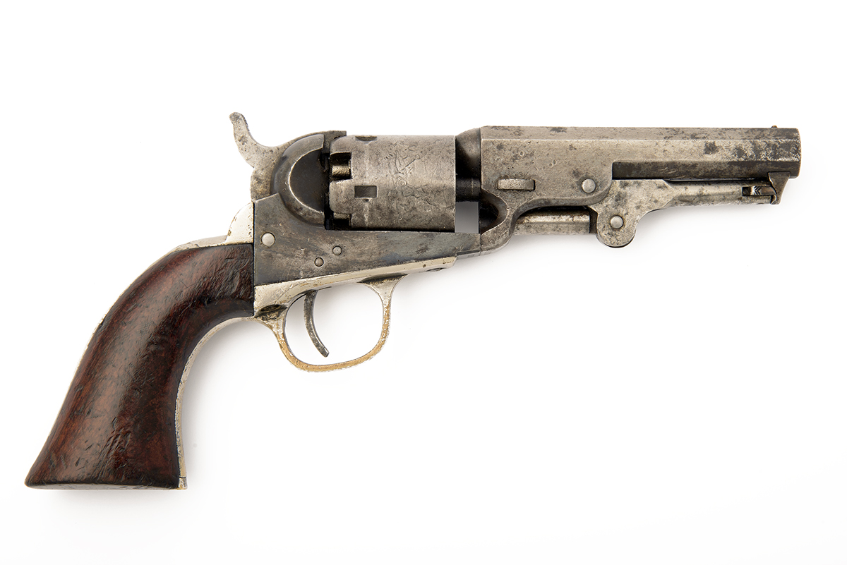 with 4in. octagonal barrel the top flat stamped 'ADDRESS COL. SAML. COLT NEW YORK U.S. AMERICA', five shot cylinder roll engraved with the famed stagecoach scene, open topped frame stamped on the left 'COLT'S PATENT', one piece walnut grips, the trigger-guard and back-strap retaining much of their silver plated finish, all matching numbers and some original blue in protected areas, it dates to 1870 and consequently was one of the last made