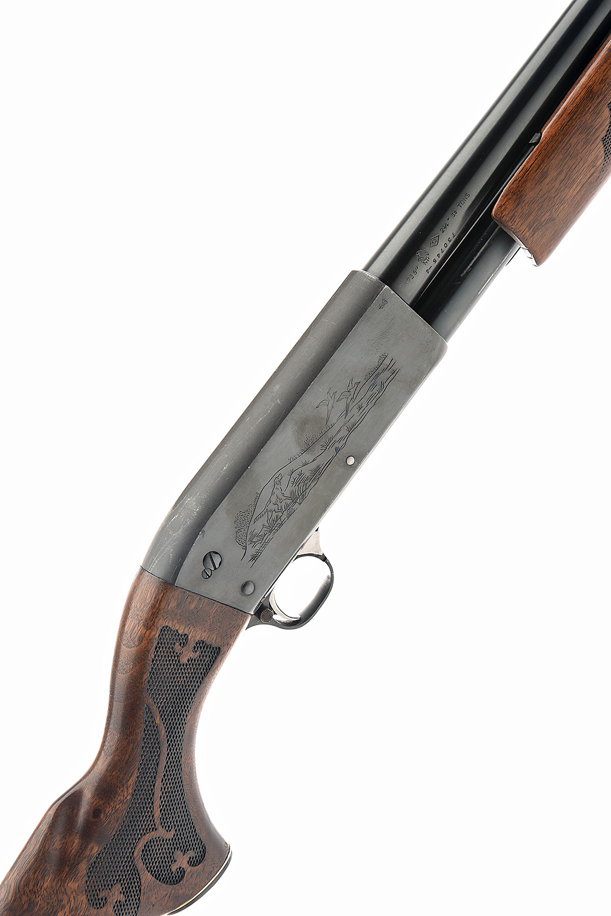 ITHACA GUN CO. 12-BORE 'MODEL 37- FEATHERLIGHT' PUMP-ACTION SHOTGUN, serial no. 730745, 1959, restricted magazine, 28in. nitro barrel, 2 3/4in. chamber, bored approx. full choke, blacked action with scenes of game in their natural habitat, 14in. ornately chequered figured stock including ventilated rubber recoil pad, weight 6lb. 14oz.