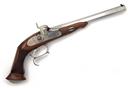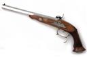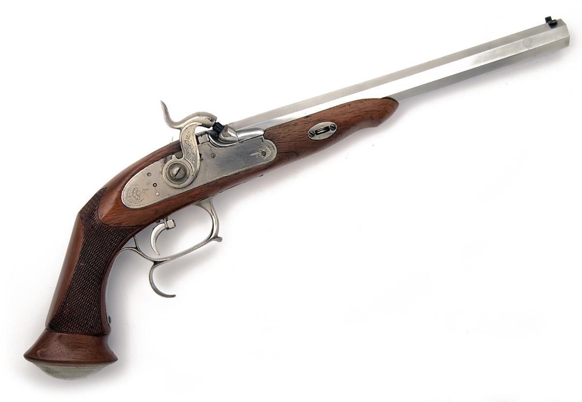 A REPRODUCTION .44 PERCUSSION PISTOL SIGNED PEDERSOLI, MODEL 'MODIFIED LE PAGE', serial no. 84060, with stainless octagonal 10 1/4in. barrel, engraved lock, walnut half-stock with modified grip (hairline, reworked match trigger and spurred trigger guard