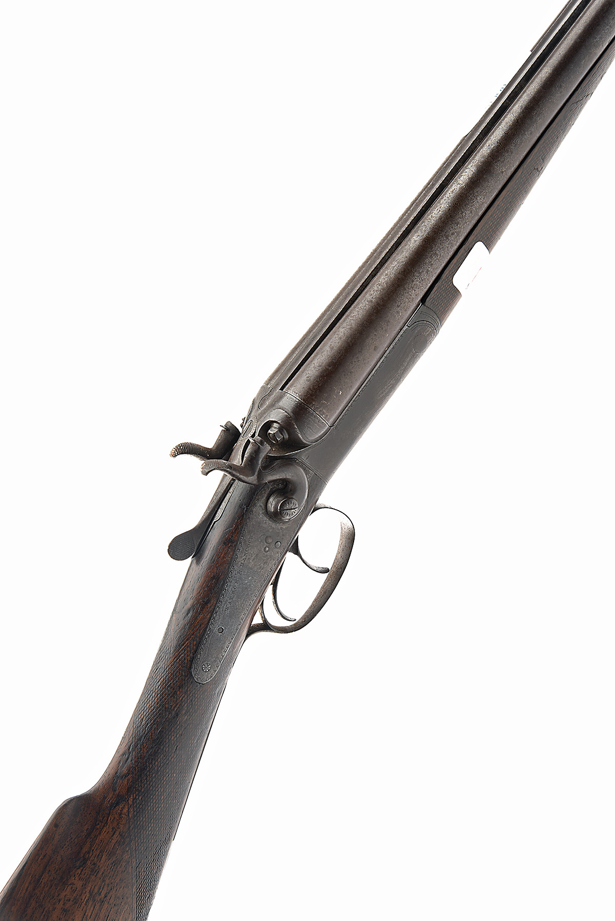 THE STOCK, ACTION AND FORE-END ONLY OF A WATSON & HANCOCK 28-BORE TOPLEVER HAMMERGUN, serial no. 3988, originally black powder proofed, treble-grip action with carved percussion fences, toplever spring broken, border engraved rebounding back-action locks, 14 1/4in. stock