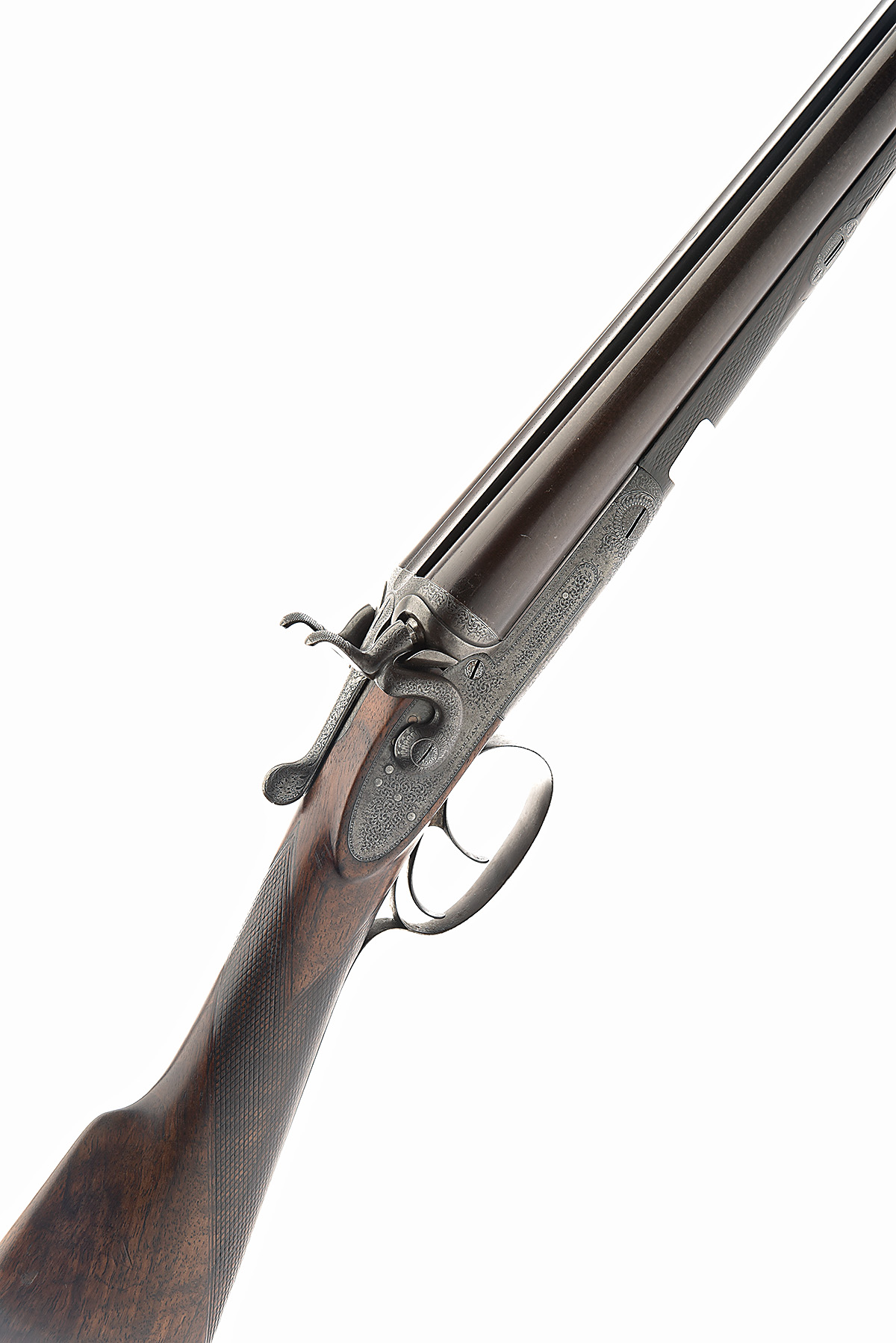 THE STOCK, ACTION AND FORE-END ONLY OF A JAMES LANG 12-BORE 1870 PATENT TOPLEVER HAMMERGUN, serial no. 4731, circa 1873, originally black powder, Lang treble-grip sliding bolt and screw-grip action, patent no. 687 of 8th March 1870, carved percussion fences, rebounding back-action locks, fine acanthus scroll engraving, the underside with rotating grip engraved 'LANG'S PATENT'