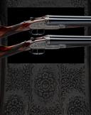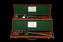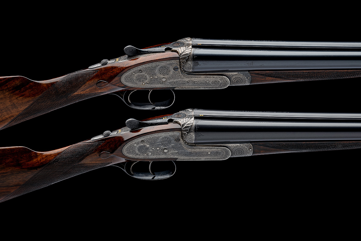 circa 1942, 28 1/2in. nitro chopperlump barrels (No.2 reproved in 2023) with acanthus scroll detailing at the breech ends and the ribs gold-inlaid '1' and '2', the tubes engraved 'F. BEESLEY 7. BURY STREET. ST. JAMES'S. LONDON.', 2 1/2in. chambers, bored approx. 1/4 choke in all, minor dents No.1, No.2 right wall at 19, carved leaf fences, toplevers fold-inlaid '1' and '2' and engraved 'PATENT', automatic safeties with gold-inlaid 'SAFE' details, fine acanthus scroll engraving with floral bouquets, the lockplates with the Beesley crown with scrolling banners engraved 'F. BEESLEY. PATENT. LONDON.', retaining traces of original colour-hardening, 15 1/4in. figured stocks including 7/8in. recoil pads, weight 6lb., in their individual lightweight leather cases