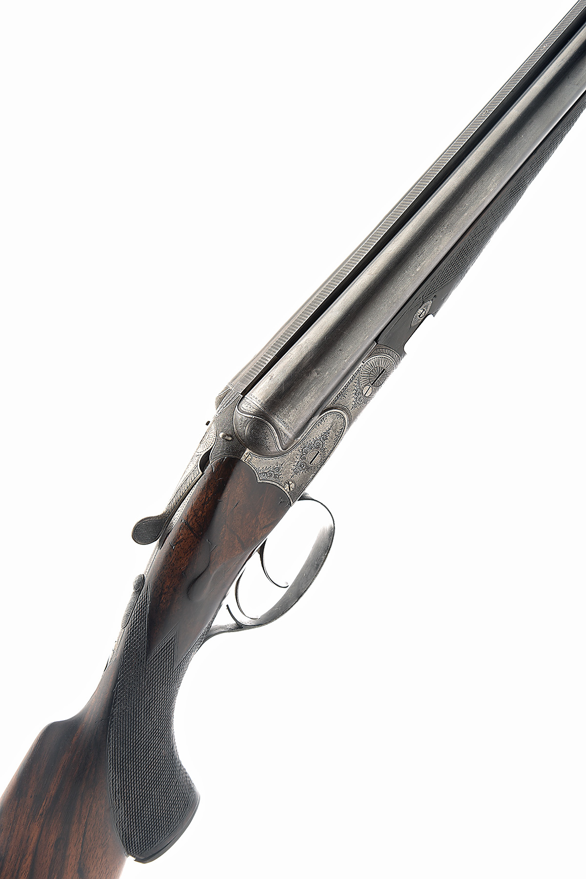 GERMAN-MADE 12-BORE BOXLOCK EJECTOR, serial no. 5508, circa 1900, 29 1/2in. nitro reproved barrels (some pits), 2 1/2in. chambers, bored approx. 1/4 and 3/4 choke, scoop-back treble-grip action, carved serpentine fences, cocking indicator studs, intercepting sears, manual safety with gold-inlaid 'SICHER' detail, border and partial scroll engraving, 14in. pistolgrip stock with cheekpiece, including 1in. ventilated rubber recoil pad, weight 6lb. 13oz.