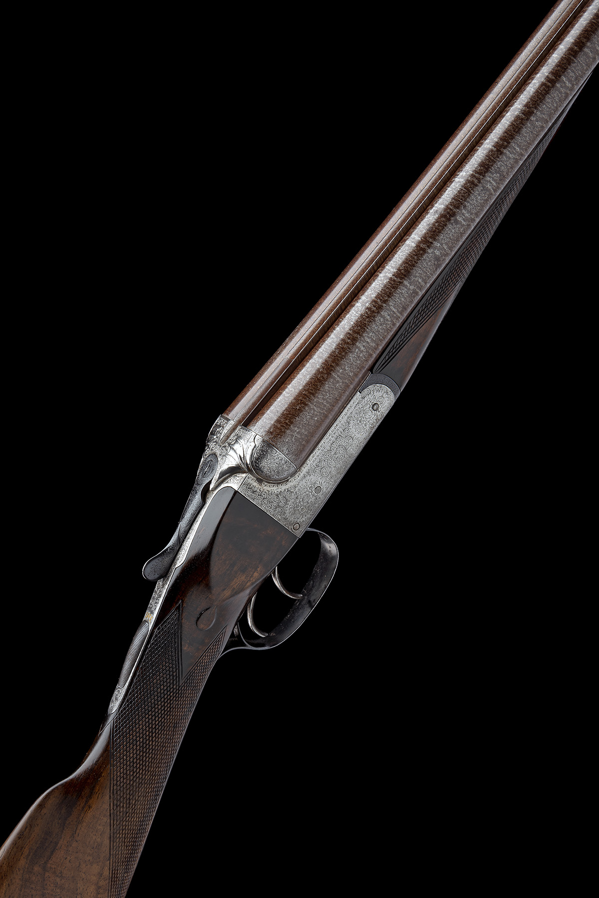 circa 1903, 30in. nitro reproved damascus barrels (in 1988), rib engraved 'CHARLES BOSWELL. MAKER. 126 STRAND. LONDON. W.C.', 2 1/2in. chambers, bored approx. true cyl. and 1/2 choke, treble-grip action with carved stylised acanthus leaf fences, automatic safety with gold-inlaid 'SAFE' detail, bouquet and scroll engraving, brushed bright and blued finish, 13 3/4in. figured replacement stock, weight 6lb. 5oz., in a tan leather case