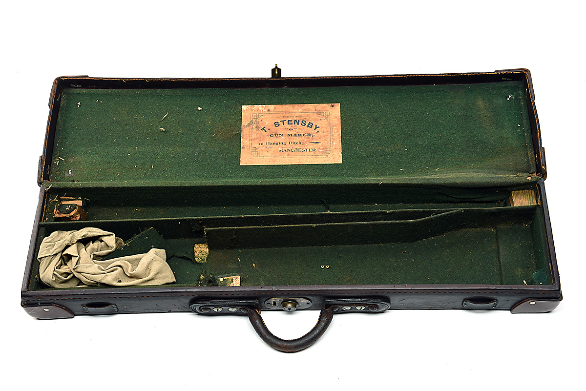 A T. STENSBY LEATHER SINGLE GUNCASE, fitted for 30in. barrels, the interior lined with green baize, a paper T. Stensby (20 Hanging Ditch, Manchester) trade label, brass lock (key missing), replacement leather corners, the lid exterior embossed with 'A..C.D.'