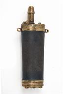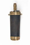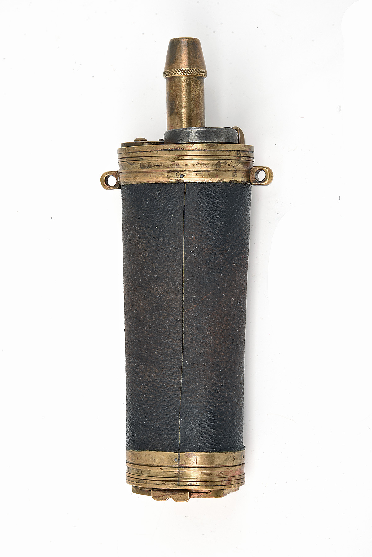 A GOOD LARGE 3-WAY POWDER FLASK, believed to be a mid-20th Century reproduction, with graduated spout, leather-covered body, base trap with access slide, unsigned, working spring, some age-related wear, 6 1/2 in.