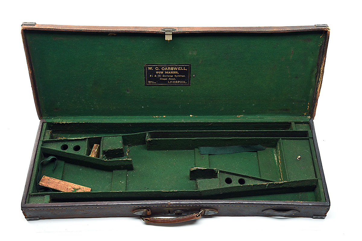A BRASS-CORNERED LEATHER DOUBLE GUNCASE, fitted for 28in. barrels (could adapt to 30in.), the interior lined with green baize, a W.C. Carswell trade label, brass lock (key missing), the lid exterior with a central brass plaque with 'J.B.L.'