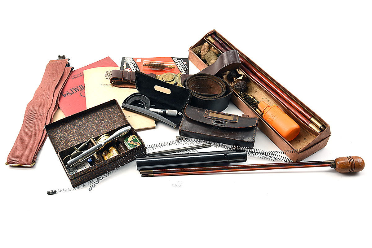 A COLLECTION OF GUN CLEANING EQUIPMENT, SCOPE MOUNTS, BELTS,SLINGS