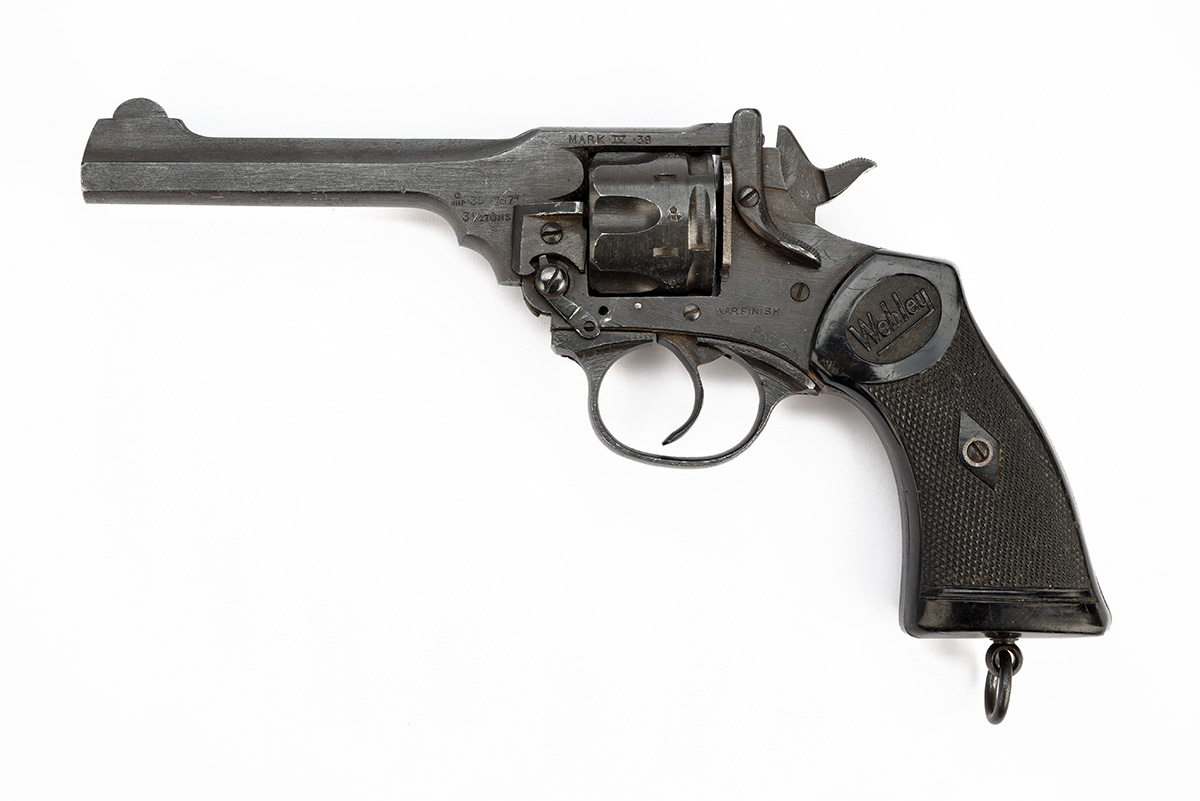 ** A .38 (200) WEBLEY & SCOTT 'WAR FINISH' MKIV REVOLVER, serial no. 75951, with 5in. barrel, break-open frame with auto-ejecting fluted cylinder and black chequered hard rubber grips, much military finish