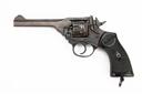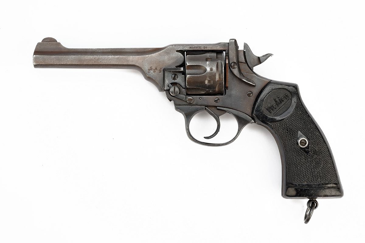** A .38 (200) WEBLEY & SCOTT MKIV REVOLVER, serial no. A5839, circa 1947, with 5in. barrel, break-open frame with auto-ejecting fluted cylinder and black chequered hard rubber grips, South African police marks, older refinish