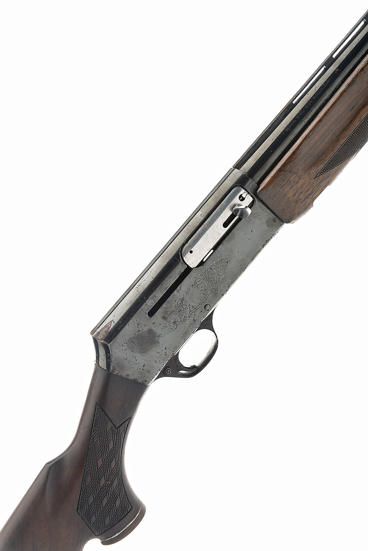 BROWNING ARMS CO. 12-BORE 'BROWNING 2000' SEMI-AUTO SHOTGUN, serial no. 86983 C57, for 1975, 26in. nitro barrel with 6mm ventilated matt rib, 2 3/4in. chamber, bored approx. 1/2 choke, manual push-button safety, blacked action with partial acanthus scroll engraving, 14 1/2in. pistolgrip stock