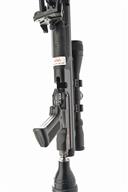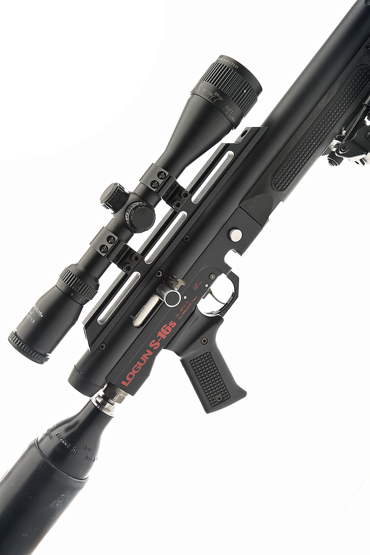 A .22 PRE-CHARGED PNEUMATIC AIR-RIFLE, SIGNED LOGUN 'MODEL S-16', serial no. 18585, 23in. shrouded barrel including sound moderator, receiver with raised rail and fitted with a Nikko Stirling Mountmaster 3-9x40 AO telescopic sight, manual push-button safety, detachable magazine (present), black rubberised grip, rear buddy bottle acting as stock, folding bipod, untested, in its Logun canvas slip with filler adapter and instruction manual and canvas sling