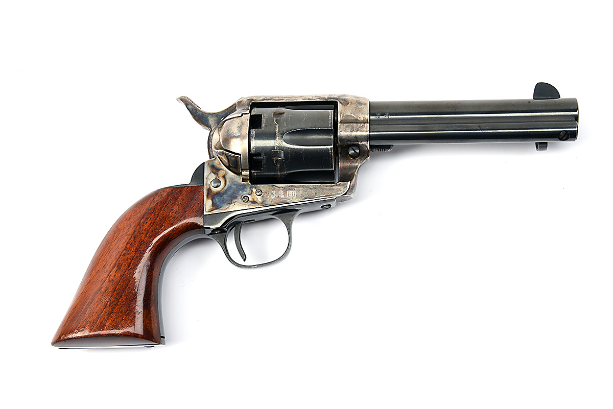 A REPRODUCTION .44 PERCUSSION REVOLVER SIGNED UBERTI, MODEL 'SINGLE ACTION ARMY', serial no. 149405, UK market model with 4 5/8in. blued barrel, solid colour hardened frame, blued fluted cylinder and smooth walnut grips