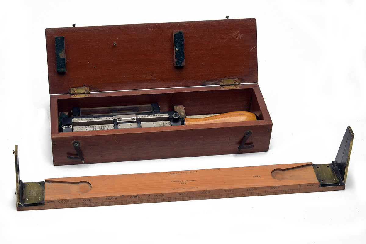 One brass and wood by Raphael S Ltd. London, dated 1915, marked 'INCHES 10THS & 50THS', 2 INCHES TO 1 MILE', numbered 3642, the brasswork with Broad Arrow markings (2)
