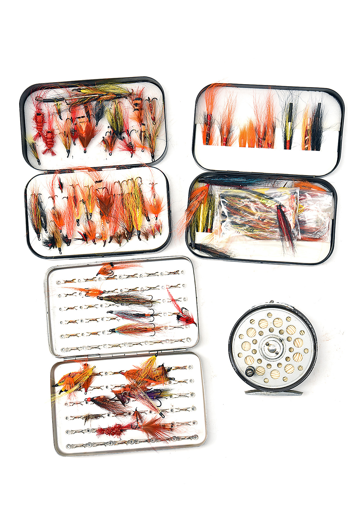 A COLLECTION OF SALMON FLIES WITH A FARLOWS COBRA FLY REEL