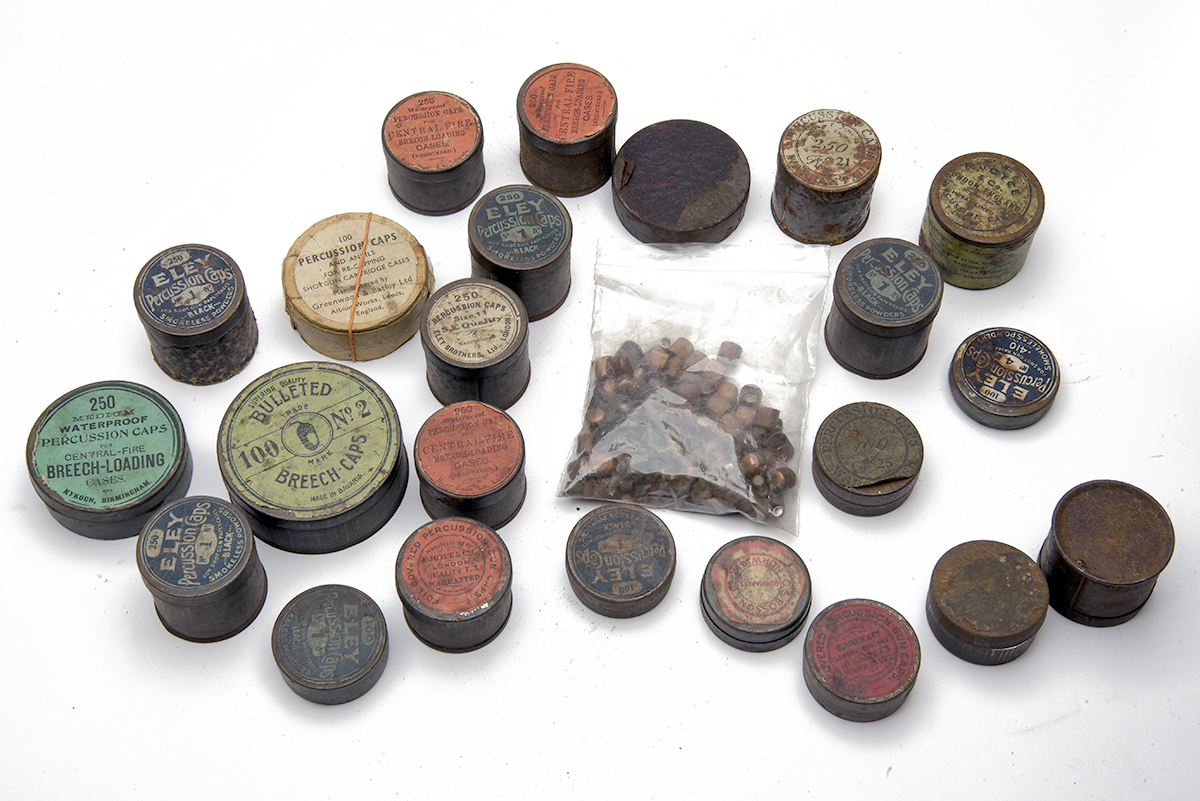 A MIXED GROUP OF 23 COLLECTABLE VINTAGE PERCUSSION CAP TINS, noted Eley, Joyce, Kynoch, most with some content, very mixed condition and some duplication, plus a bag of mixed caps