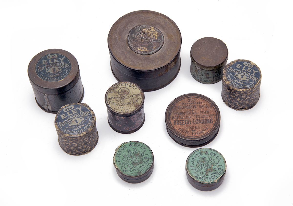 A GROUPING OF NINE BETTER EARLY COLLECTABLE PERCUSSION CAP TINS, includes Eley, Kynoch and Joyce; noted an Eley tin with impressed and guilded lid label for punt-gun caps, opened but with content; large Eley 'Black' tin for 250 caps with content; japanned Kynoch tin with content, mixed condition