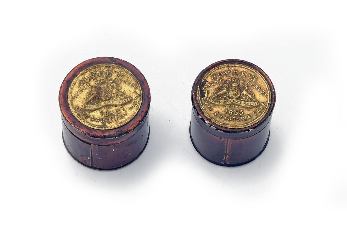 A PAIR OF RARE EARLY JOYCE PERCUSSION CAP TINS,