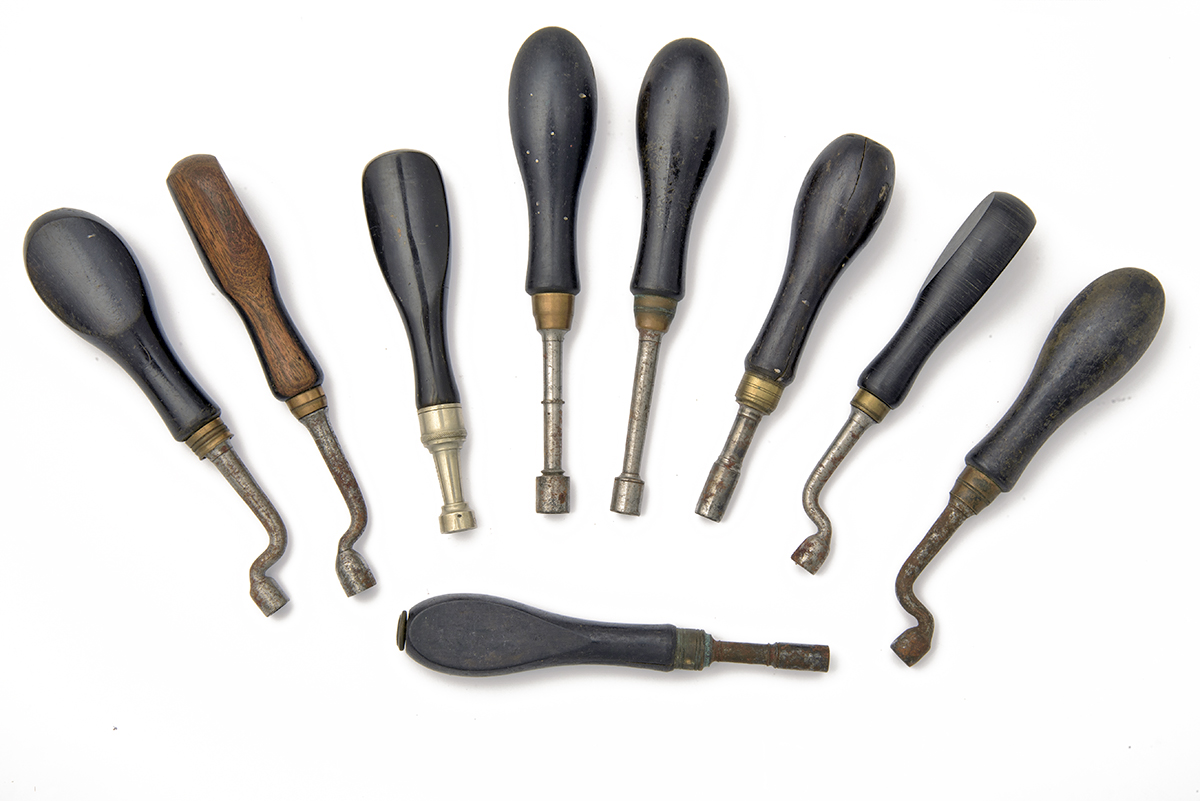 A MIXED GROUP OF EIGHT NIPPLE KEYS AND A BORE-BRUSH HANDLE,