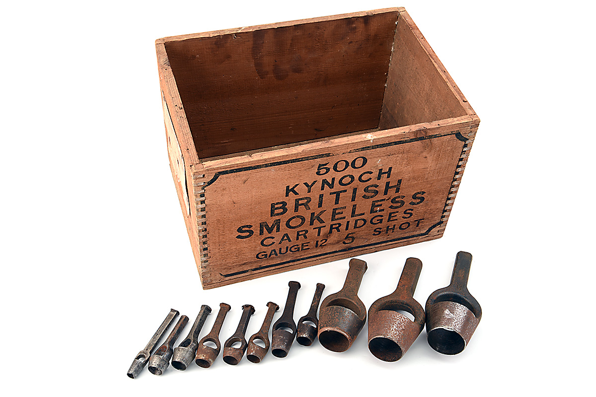 A WOODEN KYNOCH TRANSPORTATION BOX FOR 500 GUAGE 12 CARTRIDGES PLUS A GROUP OF 11 WAD CUTTERS/PUNCHES, crate circa 1950s, with black stencilling on both of the longer sides, with black carpenter's shop details on one interior side, a tacked paper transportation label for the LM&S Railway (damaged) on one small end, the opposite end with modern felt tip script, plus a variety of mixed condition wad cutters, sizes from 1 3/4 in. to 3/8 in., box with some worm, wad cutters used with some heavy wear