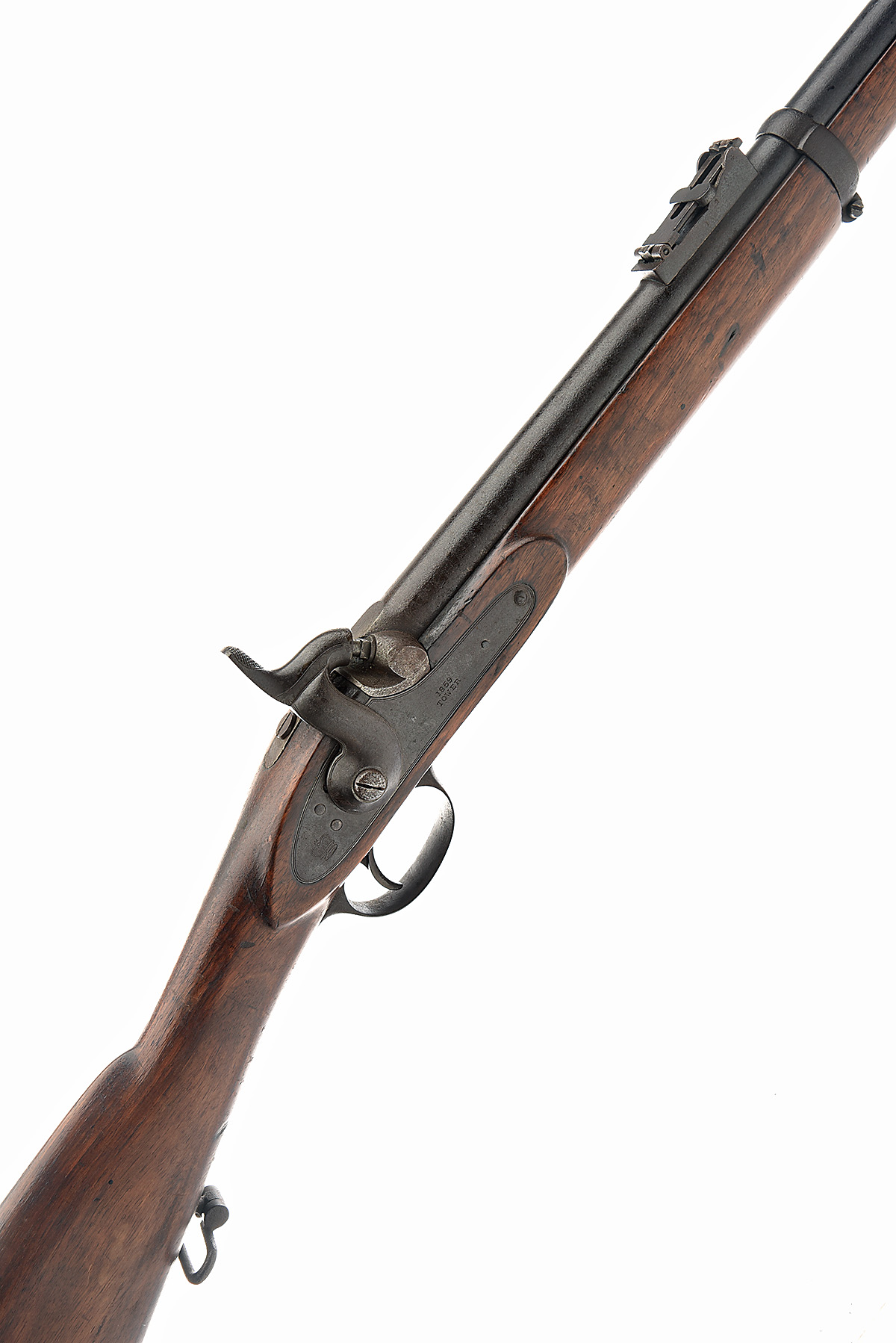 A .577 PATTERN 1856 TWO BAND PERCUSSION RIFLE SIGNED TOWER 1859, no visible serial number, with 33 in barrel block and blade front-sight and ladder rear-sight, borderline engraved lock stamped with a crown on the tail and '1859 / TOWER' to the centre, regulation iron mounted full walnut stock, complete with sling swivels and original rod