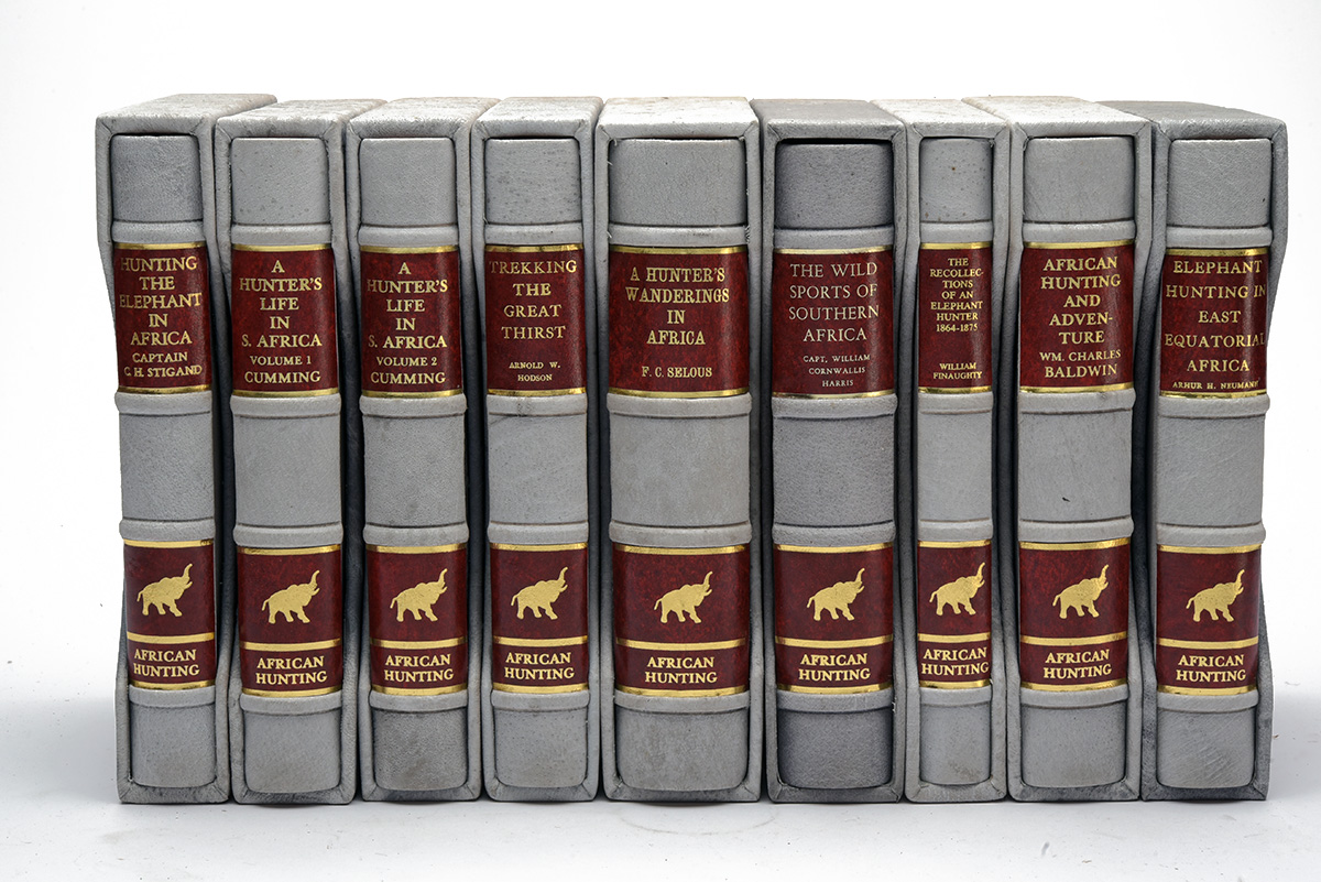 A COLLECTION OF NINE MATCHING BUFFALO-HIDE BOUND 'AFRICAN HUNTING' BOOKS, comprising of 'A HUNTER'S LIFE IN S. AFRICA VOLUME 1', 'A HUNTER'S LIFE IN S. AFRICA VOLUME 2', TREKKING THE GREAT THIRST' by Anold W. Hodson, 'AFRICAN HUNTING ADVENTURE' by W.M. Charles Baldwin, 'ELEPHANT HUNTING IN EAST EQUATORIAL AFRICA' by Arhur H. Neumann, 'THE WILD SPORTS OF SOUTHERN AFRICA' bt Capt. William Cornwallis Harris, 'THE RECOLLECTIONS OF AN ELEPHANT HUNTER 1864-1875' by William Finaughty, 'A HUNTER'S WANDERINGS IN AFICA' by F.C. Selous, 'HUNTING ELEPHANT IN AFRICA' by Captain C.H. Stigand, all printed by 'BOOKS OF ZIMBABWE' with all reprinted with matching slip case