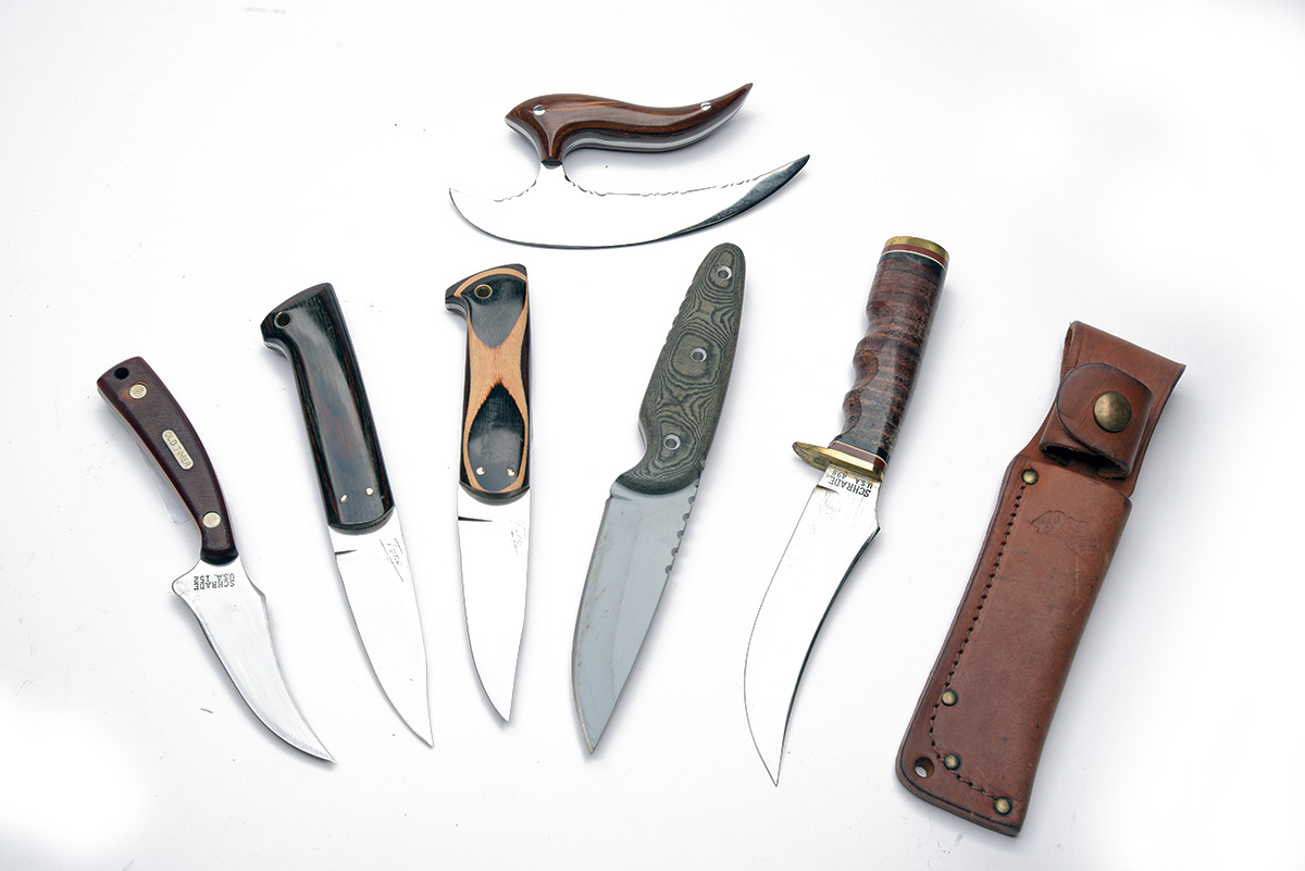 COLLECTION OF SIX FIXED BLADE KNIVES, 'Tops UTE, Schrade 152 old timer, Schrade 498 "49er" with original 49er sheath, 3 knives of various blade types with knife makers name "tony" engraved. 6