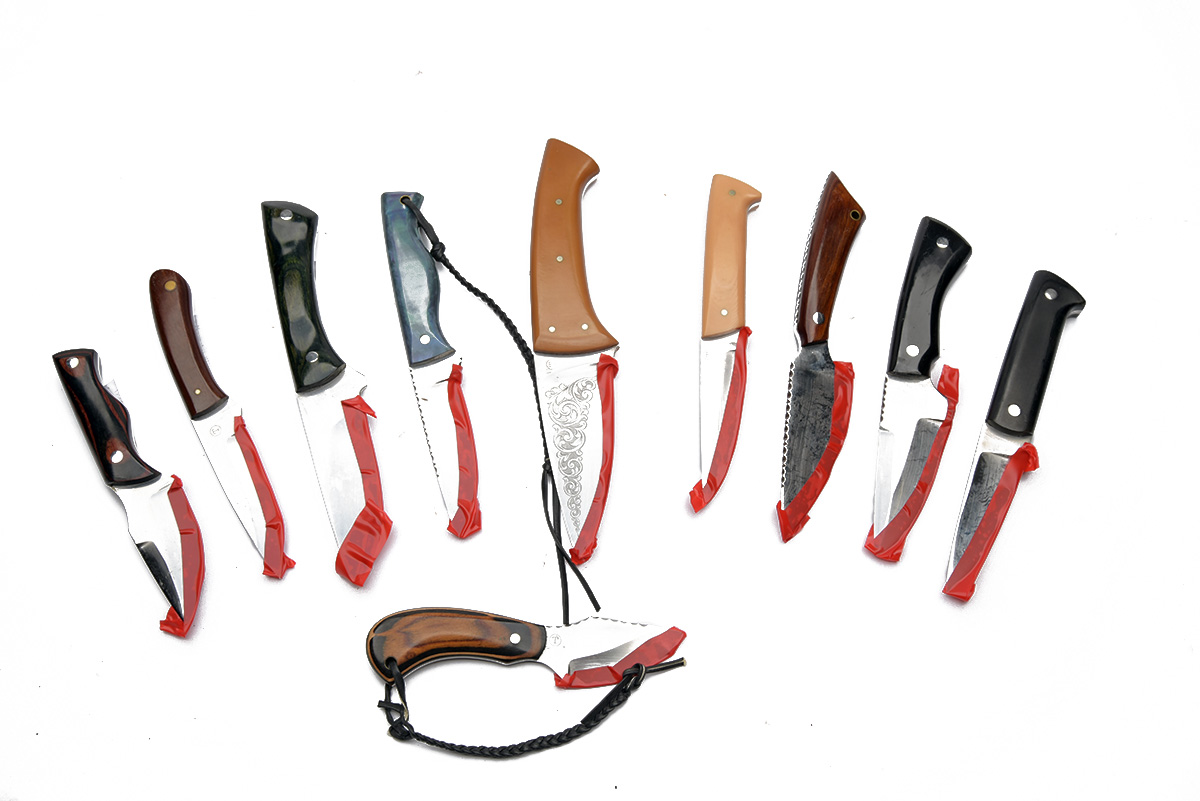 A COLLECTION OF 10 FIXED BLADE KNIVES 10 FIXED BLADE FULL TANG KNIVES OF UNKNOWN MAKER MARKED WITH CIRCLED "T" VARIOUS BLADE LENGTHS & HANDLE MATERIAL' 10