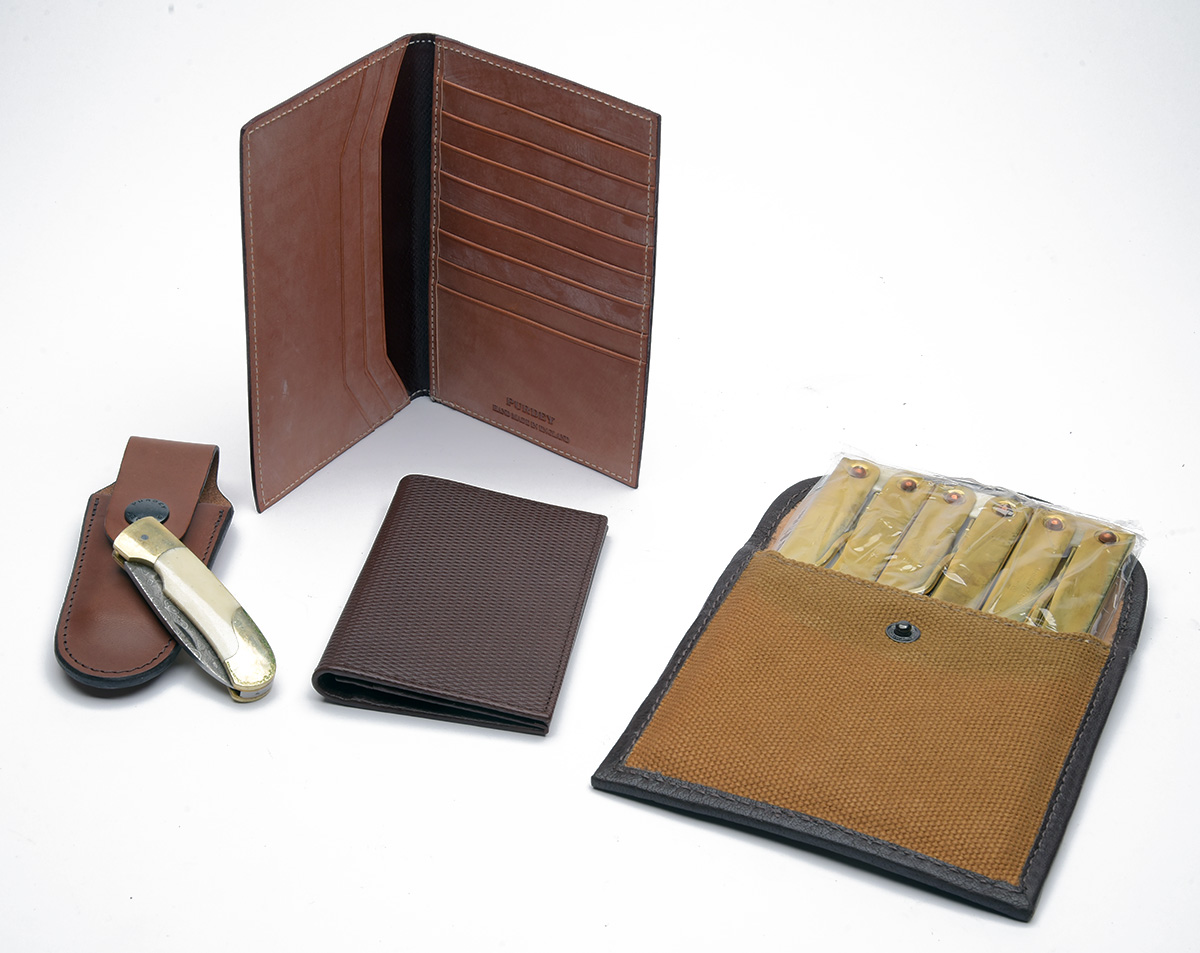 A PURDEY GIFT SET, 'handmade chequered leather business card walled, large handmade leather wallet with red goat skin lining, slip joint (uk legal carry) 2" Damascus steel & camel bone handle scales knife, set of 3 travel hanger in canvas pouch, rrp of £685'
