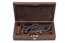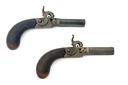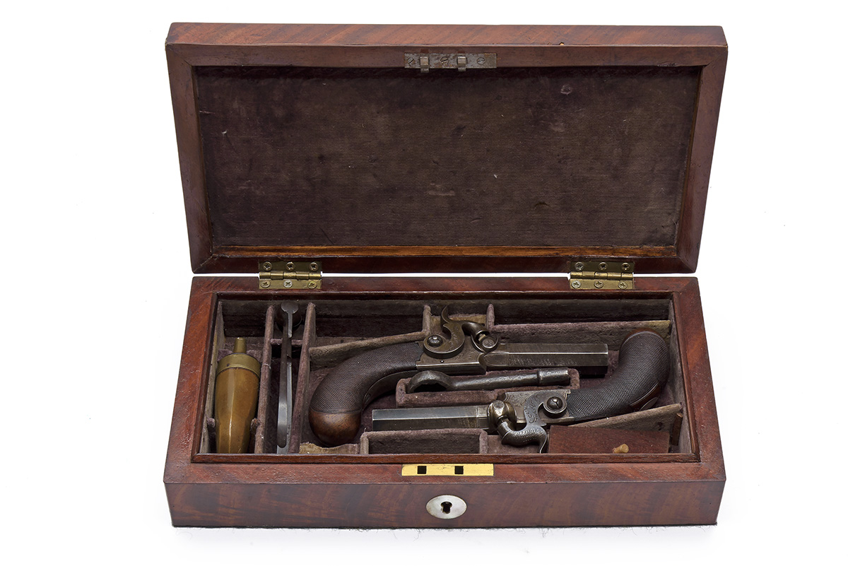 circa 1835, with octagonal turn-off 2 3/8in. barrels, borderline and scroll engraved squared actions with engraved dolphin hammers and signed on the top-strap 'YOUNG, BURY ST EDMUNDS', chequered walnut bag-shaped butts with oval white metal escutcheons to wrists and concealed automatic triggers, in their original walnut fitted case lined in brown velvet and retaining their barrel and nipple-key combination tool, a scissors mould and a period powder-flask